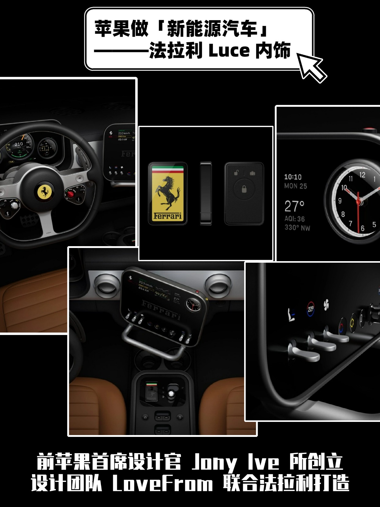 讲真要不是关注了Jony Ive(前苹果首席设计师),还真不知道法拉利出了首款纯电车型 Luce,而且这联合法拉利团队打造的内饰个人觉得差点意思,如果全权放给Jony Ive来设计应该会更大胆前卫些。突发奇想如果苹果做新能源汽车是法拉利 Luce 这样的,那做其他品类会是何种形态呢?
