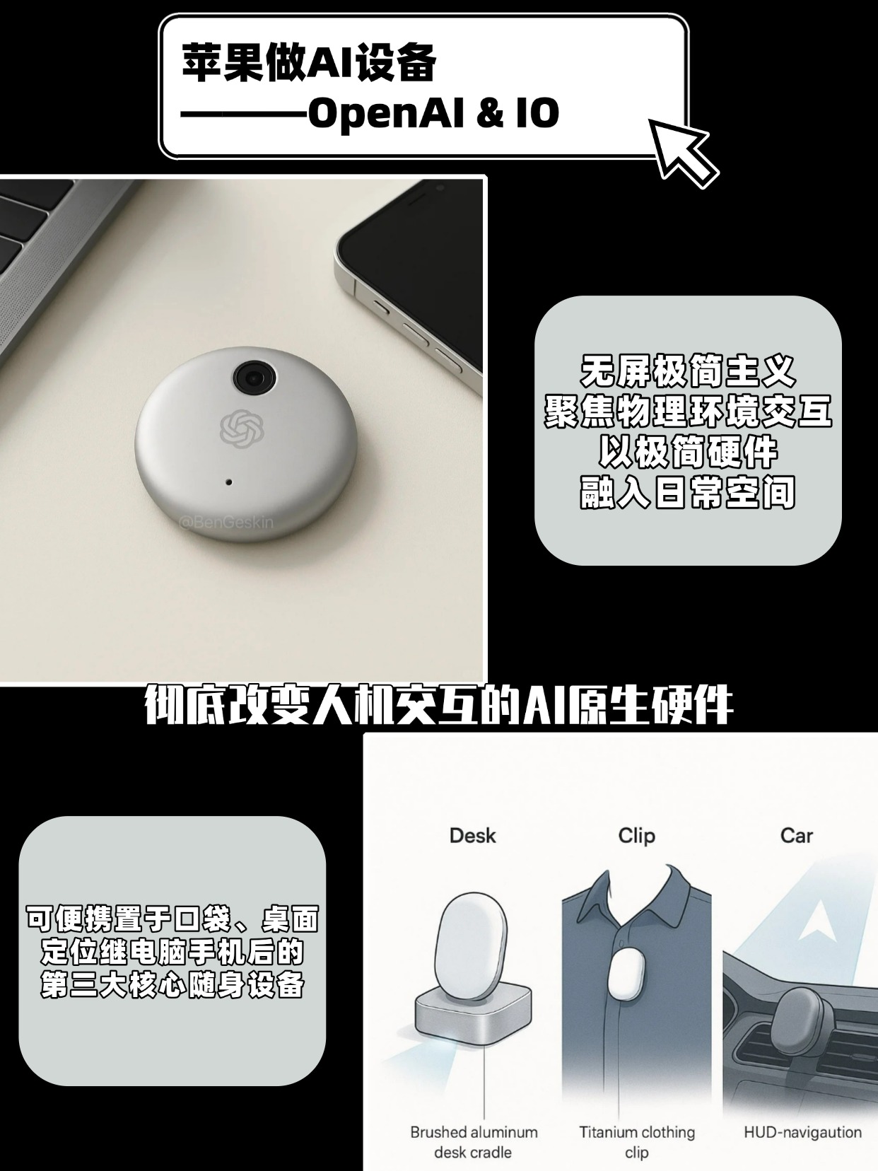 如果是AI设备我猜会是OpenAI & IO这款概念产品,无屏极简主义直接聚焦物理环境交互,外加可置于口袋、桌面的便携性,继电脑、手机后的"第三大核心随身设备"定位等等,都十分契合苹果的过往产品理念。