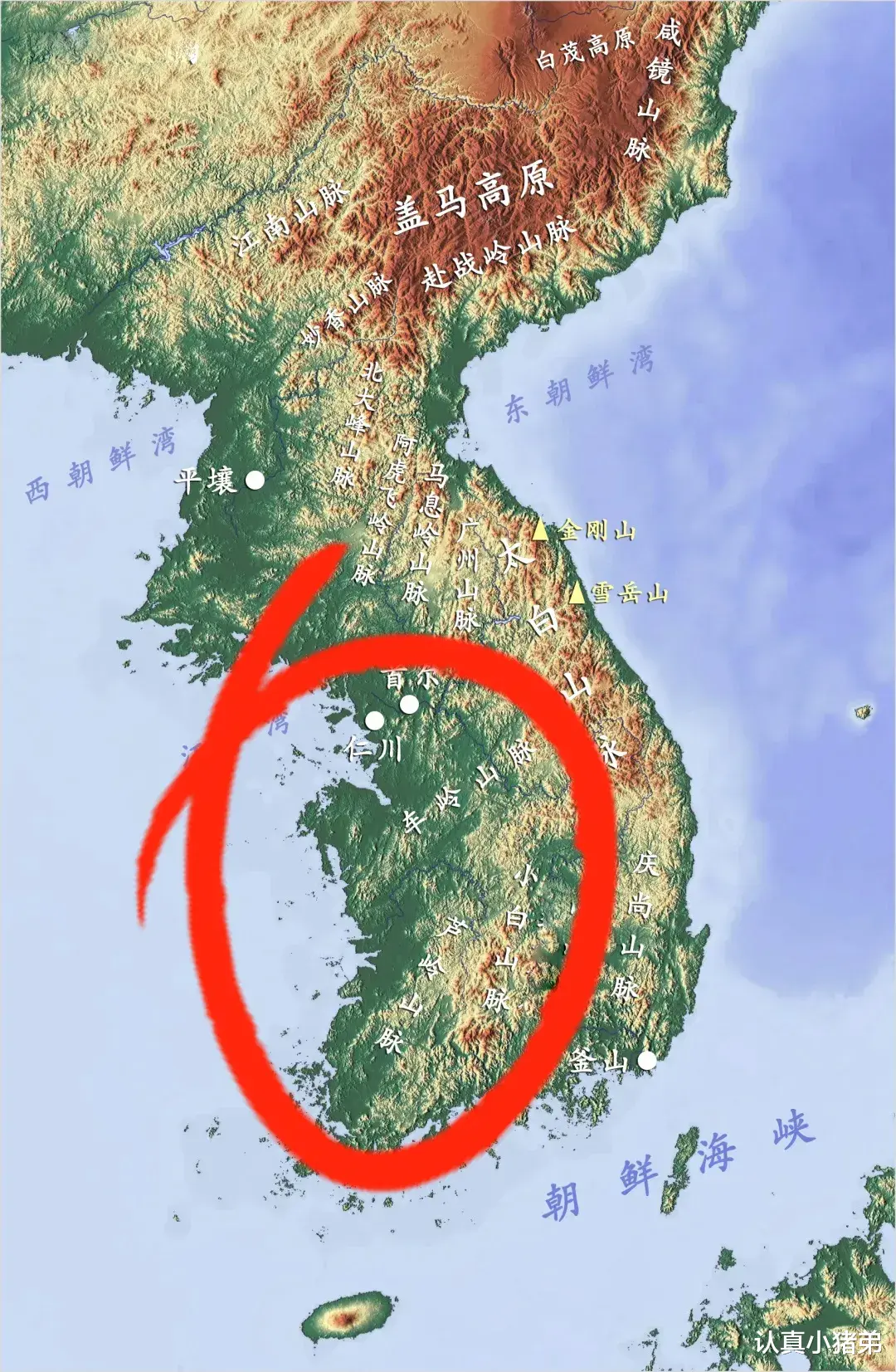 从朝鲜半岛的地形图可以看到,熊津都督府所处的地形非常不错,西边有着适合人类生存和经济发展的平原,东边则有小白山脉,车岭山脉等等,可以为国土防御所需。