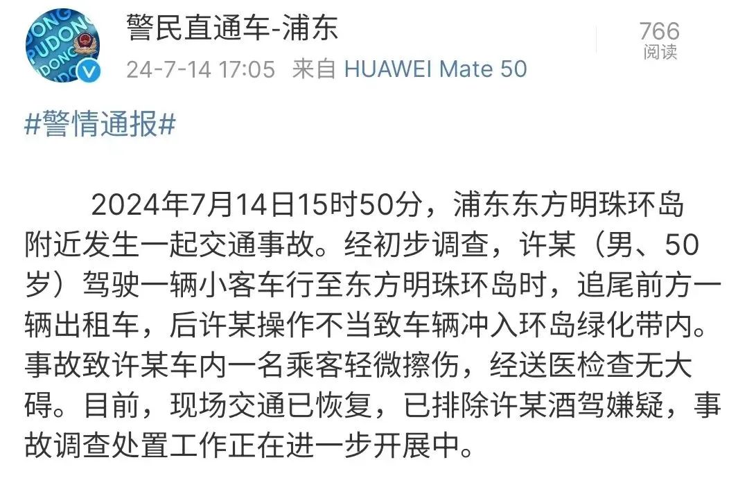同时,由于事故发生在上海浦东的东方明珠环岛附近,这一地区是上海市的重要标志枢纽之一,因此事故造成了一定影响关注。所幸交警部门迅速采取措施疏导交通,目前这起事故已排除酒驾嫌疑,调查工作将进一步开展!