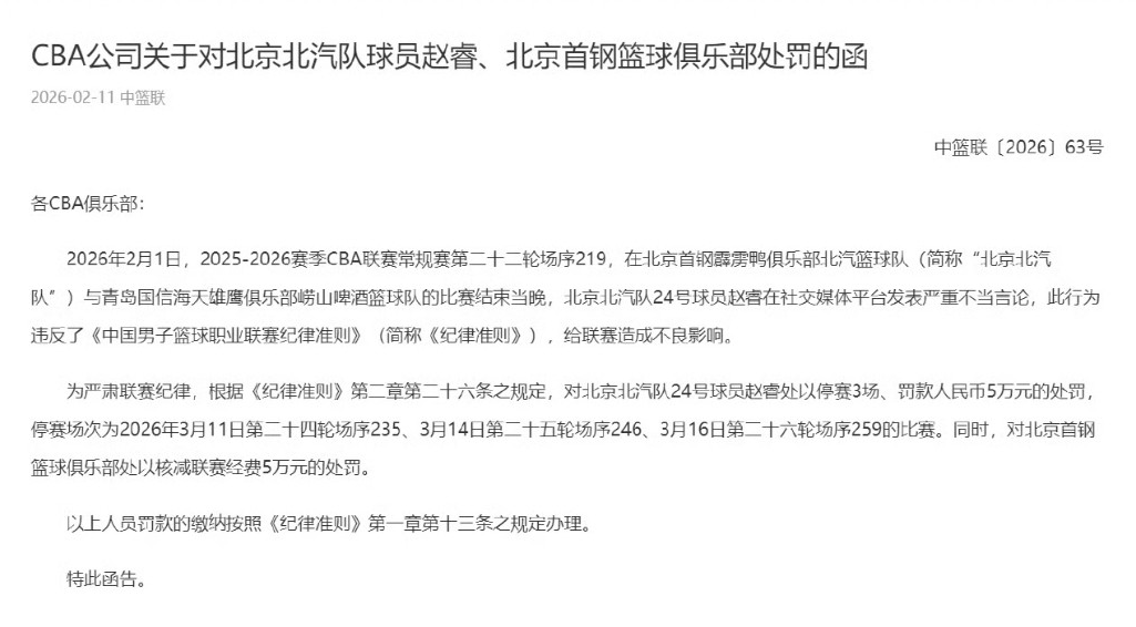 2月11日晚,CBA官方发布公告,鉴于赵睿此前在社交媒体上怼新疆球迷并发表不当言论,CBA公司出面对其开具罚单,赵睿停赛3场、罚款5万,北京首钢篮球俱乐部核减联赛经费5万。