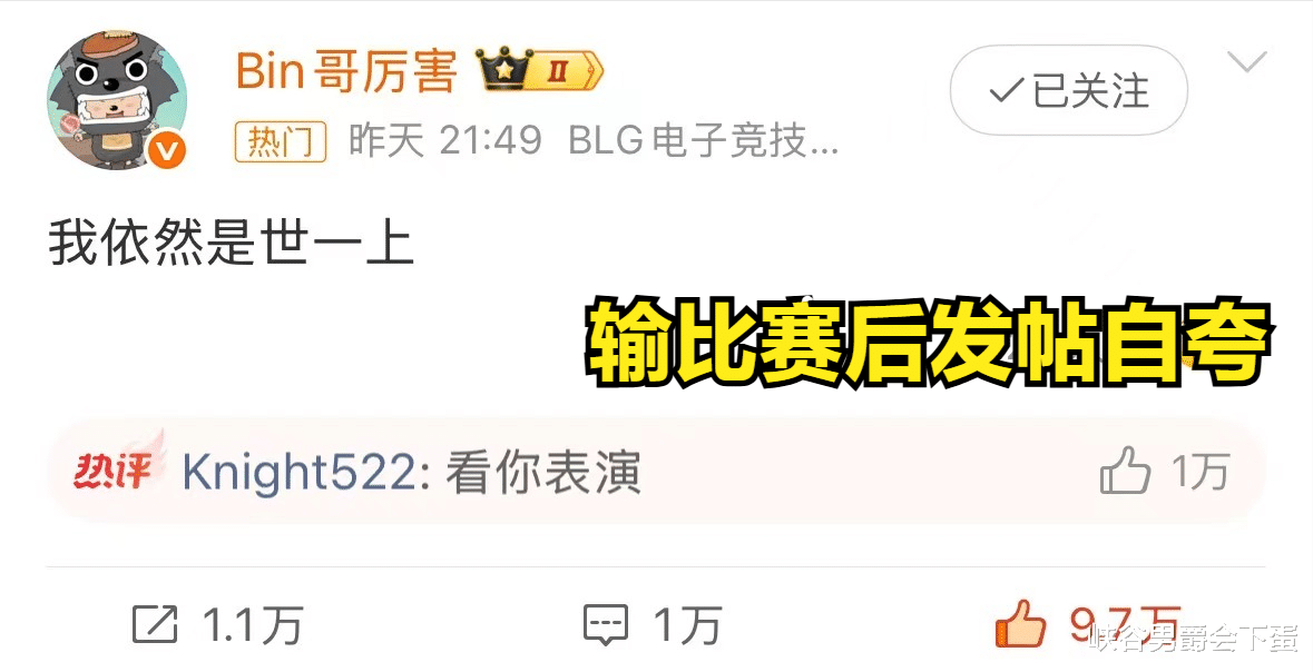 对于“继“Uzi透露不复出原因:压力太大身体吃不消”后,LPL又传来一个坏消息,Bin哥输比赛后发帖“依然是世一上”闹笑话,外国网友也跑来看戏”这件事,你怎么看呢?