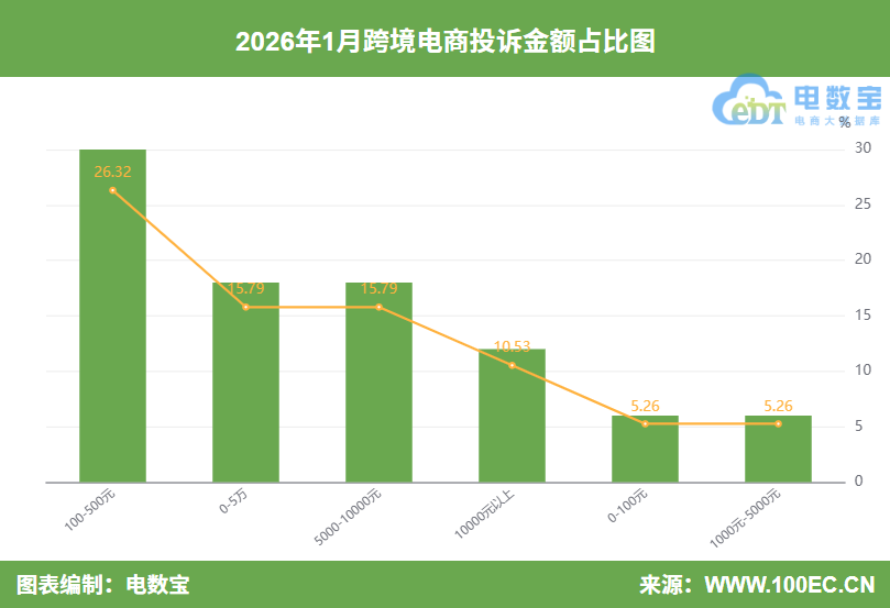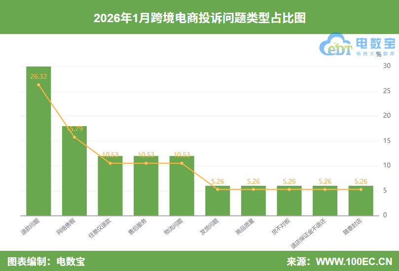 据“电诉宝”显示,2026年1月全国跨境电商用户投诉问题类型主要包括退款问题(26.32%)、网络售假(15.79%)、任意仅退款(10.53%)、售后服务(10.53%)、物流问题(10.53%)、发货问题(5.26%)、商品质量(5.26%)、货不对板(5.26%)、退店保证金不退还(5.26%)、随意封店(5.26%)。