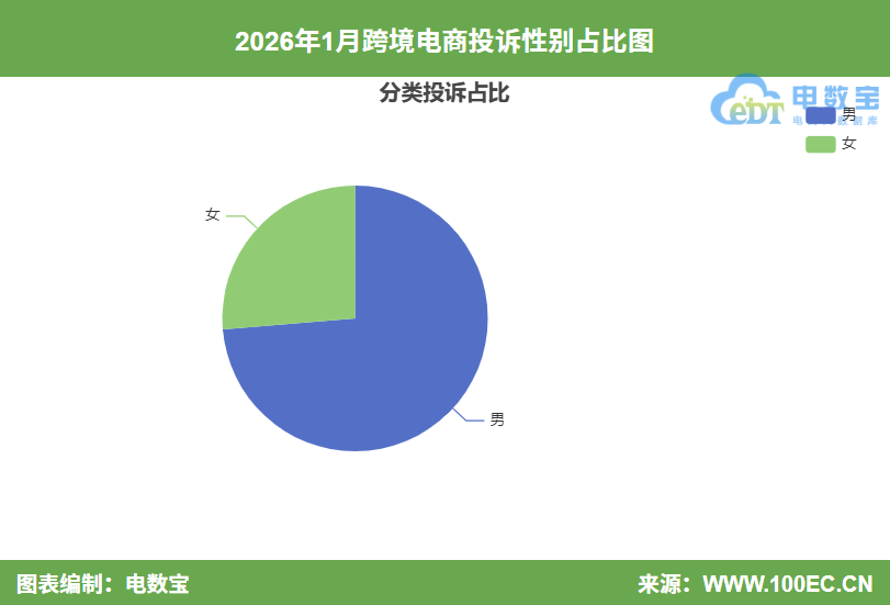 根据“电诉宝”显示,跨境电商1月男性用户投诉比例为73.68%,女性用户投诉比例为26.32%。