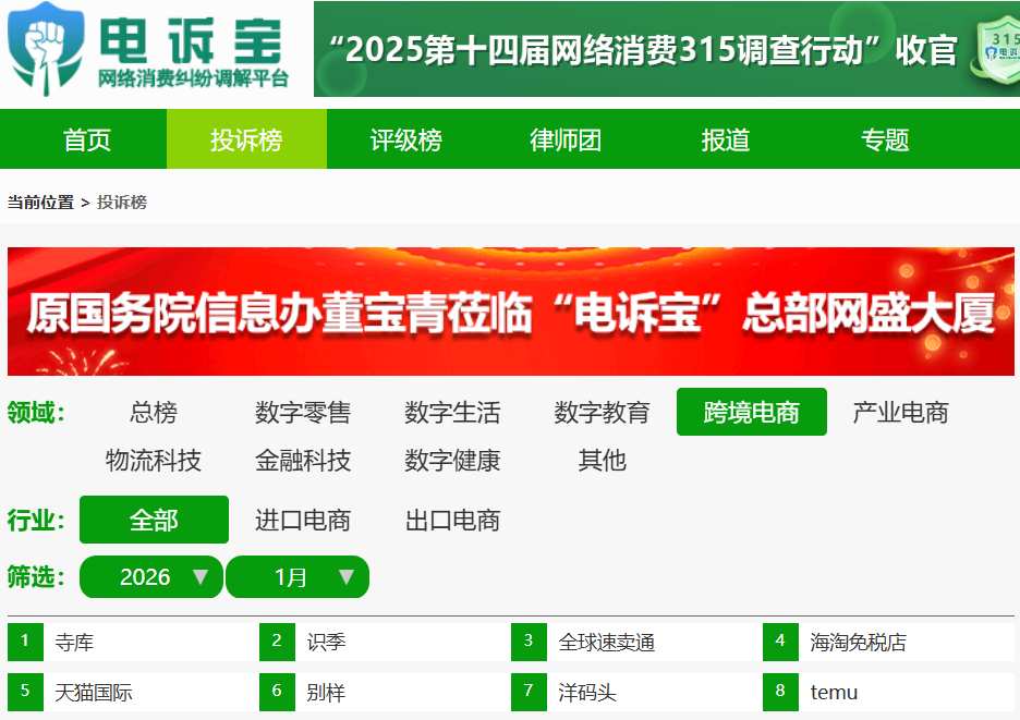 2月10日,网经社发布《2026年1月跨境电商投诉榜》(依据投诉量排行),该榜单依据国内网络消费专业消费调解平台“电诉宝”2026年1月受理的全国用户消费纠纷案例大数据生成。