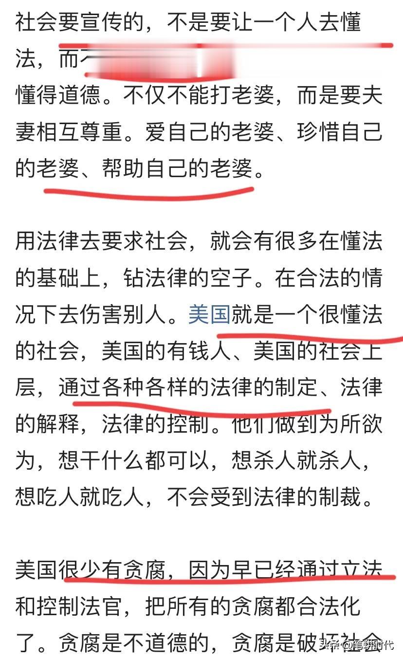 他表示让一个社会好起来,并不是要普法,而是要教大家有道德,尊重传统文化。国家和谐应该以德治国,而不是依法治国。