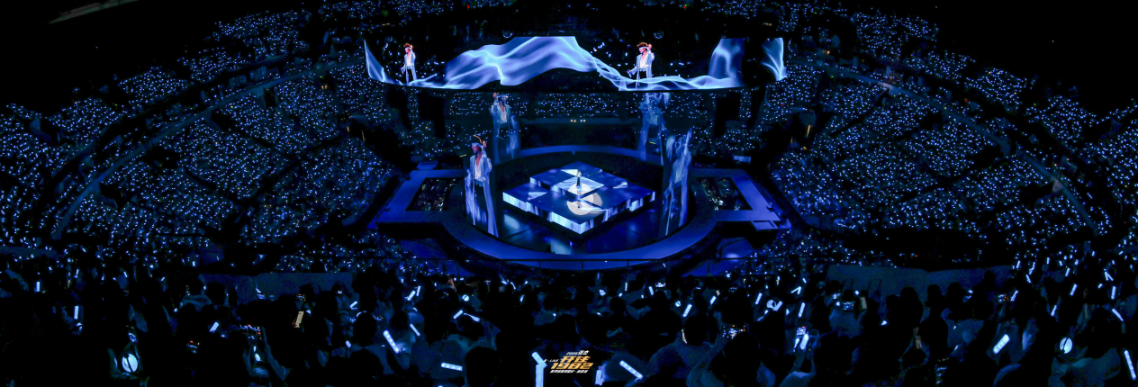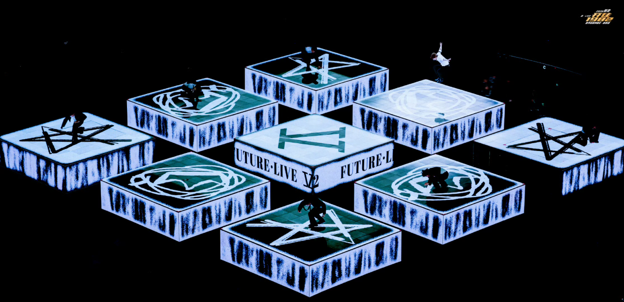 张杰新春场舞台整体造型以中国结灯笼为核心视觉元素,寓意团圆与祝福。舞台中央设置9个麻将造型的异形升降舞台,可根据演出内容进行拼接或分离,增强舞台调度的灵活性。舞台外围设置可绕全场移动的小型舞台,并配合12组升降投屏帷幔,可变幻组成50多种舞台变化,形成多角度、环绕式的视觉呈现,提升观众的现场观演体验。整套舞台被命名为「龙门阵」,旨在营造轻松交流、热闹相聚的新春氛围。