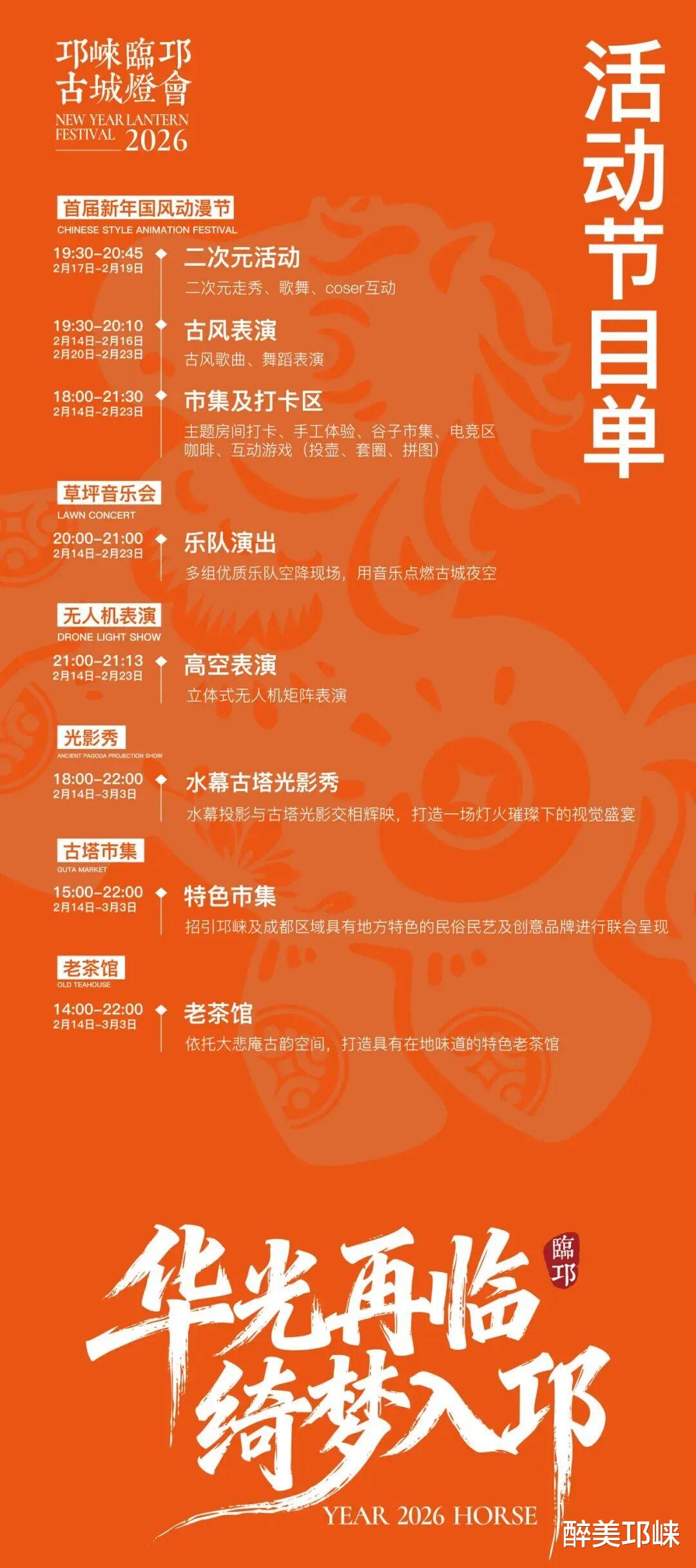 3D立体式无人机矩阵秀、喷泉巨幕光影秀轮番上演;邛崃首届国风动漫主题活动、新春草坪音乐会精彩纷呈,古塔市集的烟火气直接拉满;文脉牵灯节上,提灯祈福,文脉坊的戏台、畔池、水韵广场上,歌舞轮番上演,再现临邛不夜天的繁华与温情;更有古城漫游环线大巡游,跟着文君穿越古城(城门楼-大北街-兴贤街-文脉坊),与临邛名士相逢,共贺新春。