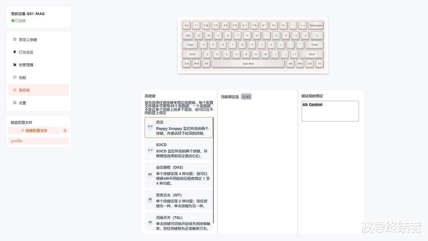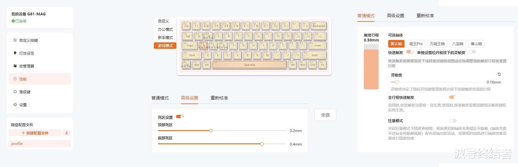 接下来就是磁轴的强项了,因为触发实现原理的优势,磁轴可以很轻易地设置每一个按键的各种参数,包括触发行程,顶部与底部死区,甚至按下与松开的灵敏度都可以分开设置。