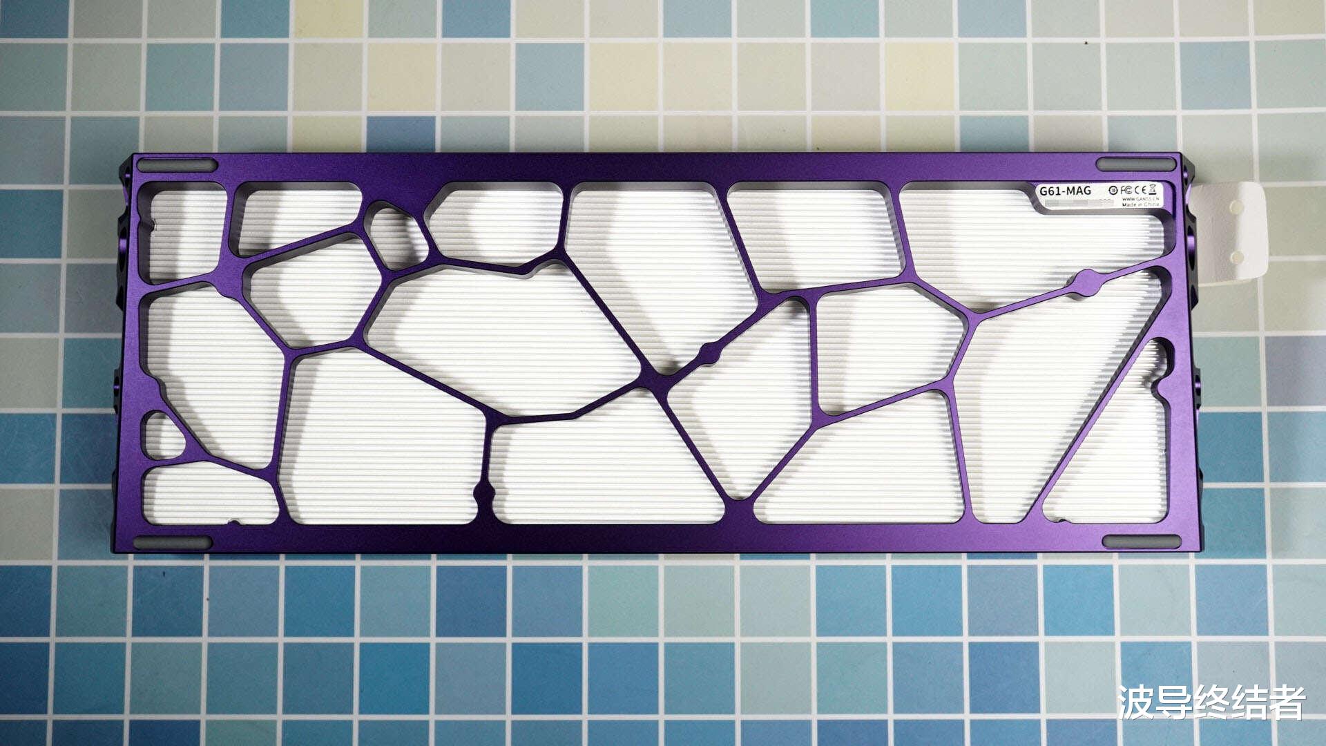 从底面可以更清楚地看到整体外壳的缕空设计,在结构强度,设计感与减重方面,都做到了相当不错的平衡。唯一一点小遗憾就是没有可调节脚撑,但键盘本体有一定的倾斜,刚好是平时习惯的角度,所以也不需要了。键盘核心做了PORON夹心棉、PET声优垫等5层的消音填充,敲击手感清脆声音适中。