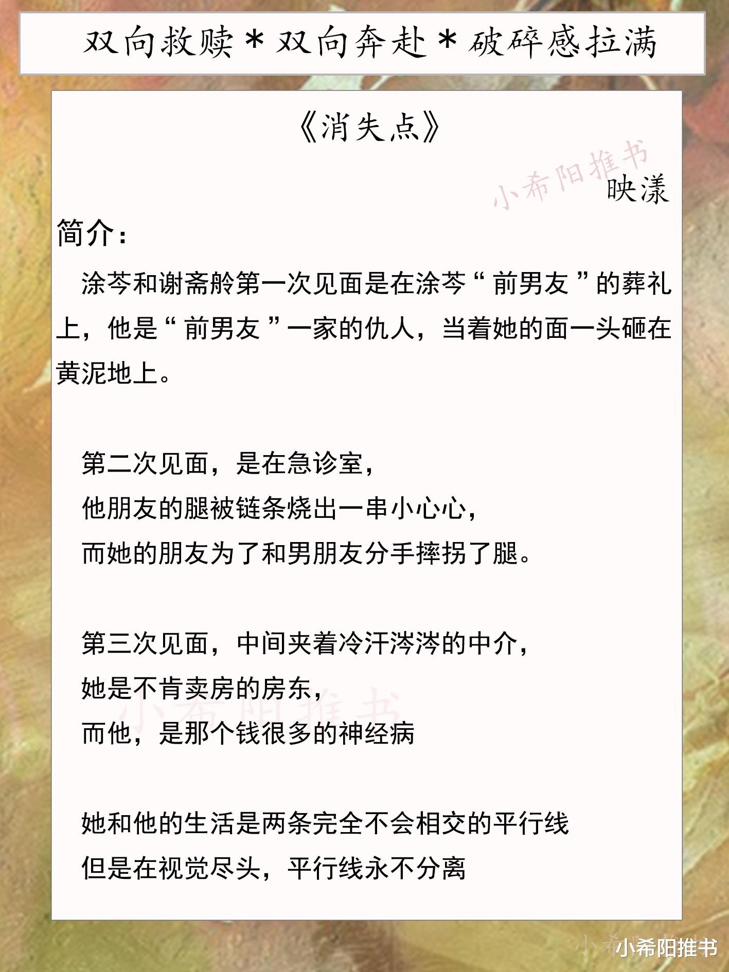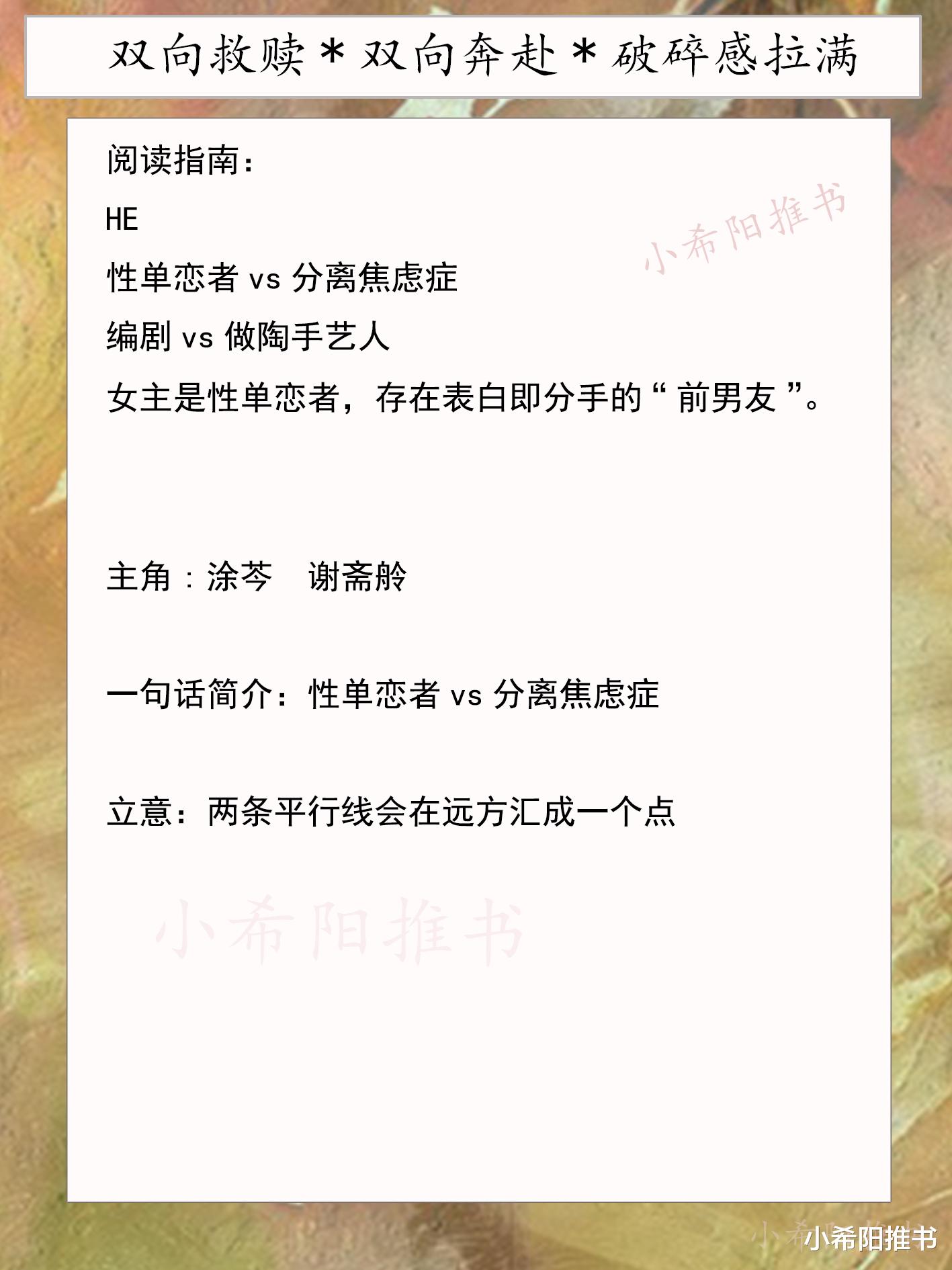 推荐一本现实向双向救赎文,男女主真的人间小苦瓜,破碎感拉满。女主患有性单恋者,只能单方面喜欢对方,一旦对方回应就会排斥;男主患有分离焦虑症,极度恐惧离别,轻则高烧耳鸣重则丧命。两个小苦瓜相互拉扯,你进我退,都不敢轻易说开始!这本救赎治愈文真的可以看看!