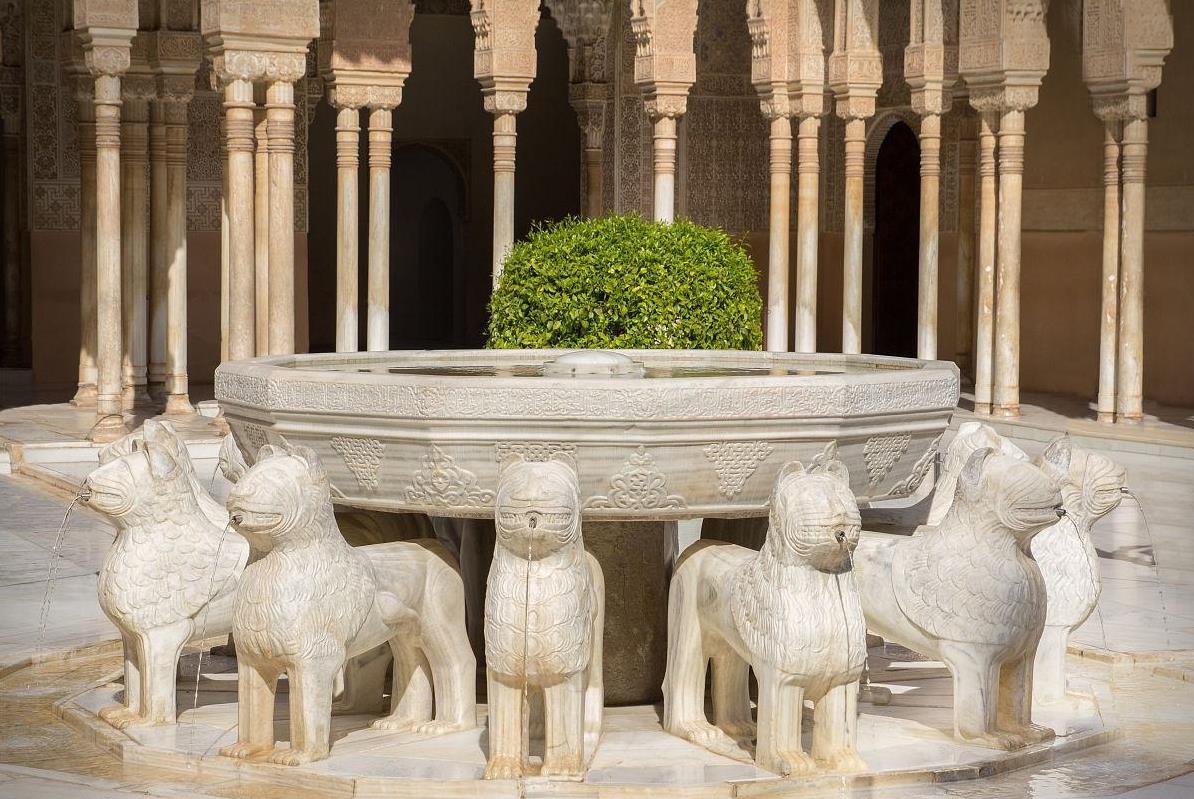 阿尔罕布拉宫的喷泉接下来在竖井上装个水车,用牲口来转这个水车,把竖井里的水泵到上面的水池里。然后再从水池修一条引水渠通到阿尔罕布拉宫,这样水压就大了很多,就可以建喷泉了。阿尔罕布拉宫里有很多喷泉,其中最精致的一个叫十二狮钟喷泉。这个喷泉从中午12点开始喷水,每个狮头代表一个时辰,这些狮头都立在一个大理石圆盘底座上。到了第二天中午12点,所有的狮头一起喷水,然后重新开始计时。每个狮头代表一个时辰,也就是两个小时。比如说早上6点,就会有九个狮头在喷水。