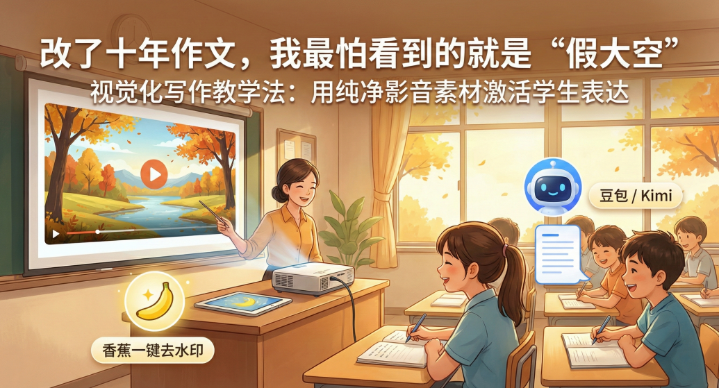 写作痛点解决方案核心工具缺乏灵感播放无水印 意境视频 (MP4)香蕉一键去水印描写空洞观察高清 摄影图集香蕉一键去水印结构混乱生成 写作提纲/词库豆包 / Kimi写作不是无中生有,而是有感而发。当我们用纯净的影音素材去冲击学生的感官,他们的文字自然会有温度。如果你觉得这个方法能救活你的作文课,请点亮右下角的“赞”,让我们一起帮学生找回表达的乐趣。