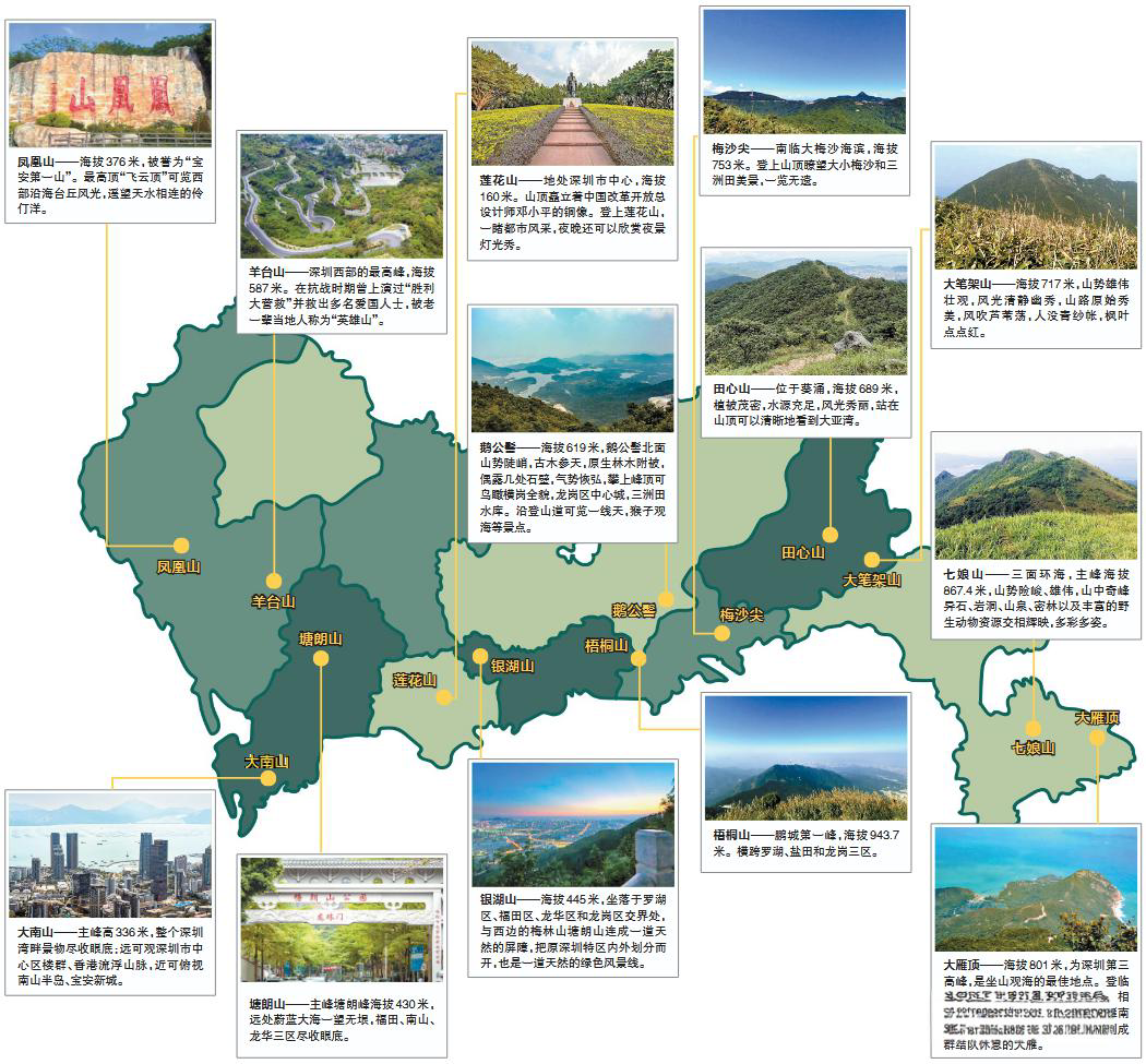深圳串联以山地森林生态系统为主体的区域绿地,形成“一脊”即1条山脊翠脉,构建“三径三线”远足径体系。“三径三线”是指鲲鹏经、凤凰径、翠微径,以及阳台山环线、马峦山环线、三水线。