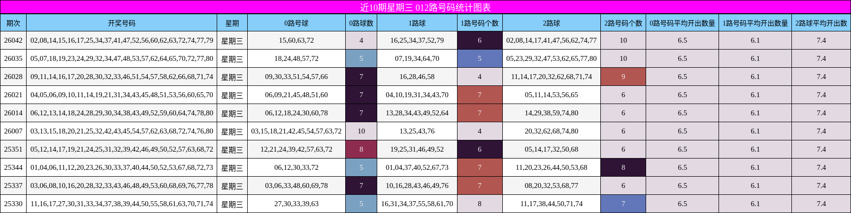 012路聚焦:2路持续强势,0路有望补涨从012路分布看,近10期星期三2路号码共开出74个,远高于0路(65个)和1路(61个),平均每期7.4个,是三路中最高。上期2路开出10个,延续强势,而0路仅4个,1路6个,显示2路热度未减。