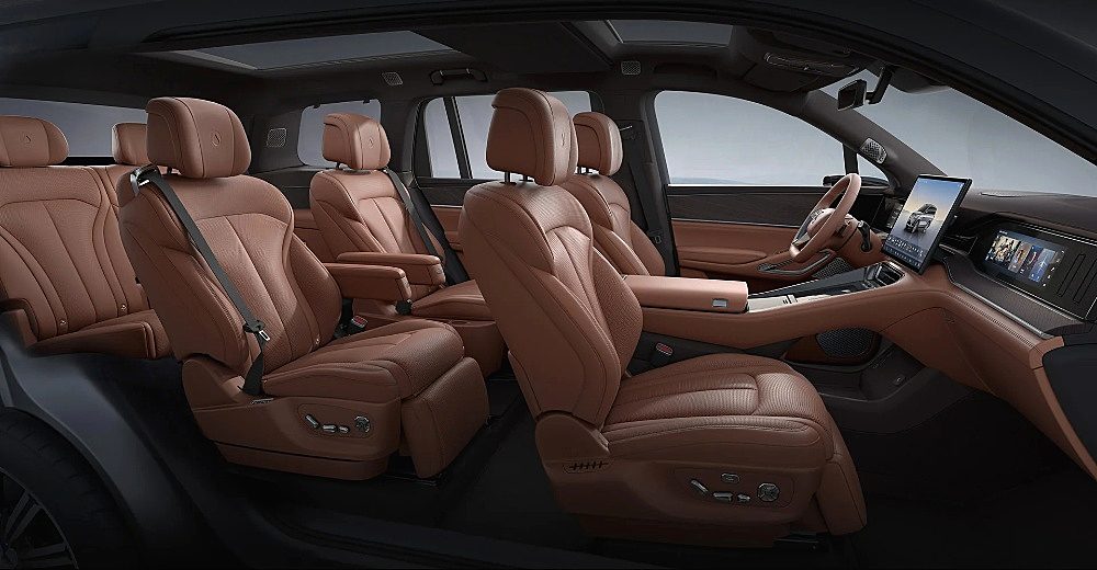 腾势N9定位大型SUV,车身尺寸为5258mm×2030mm×1830mm,轴距方面则达到3125mm。采用“2+2+2”的六座布局,在满员情况下,后备箱仍能轻松容纳高尔夫球包等大型物品,实用性与豪华感并存。