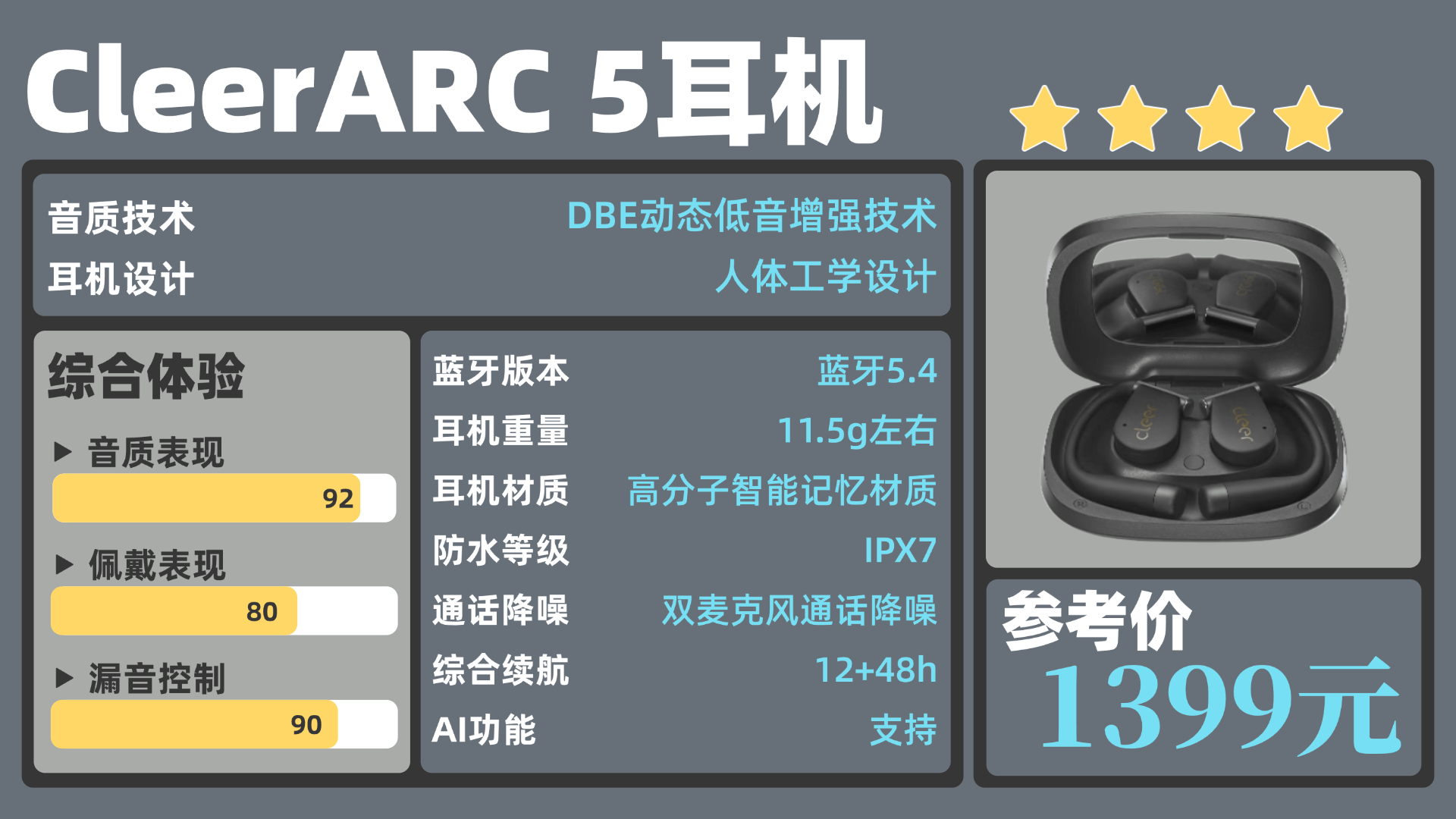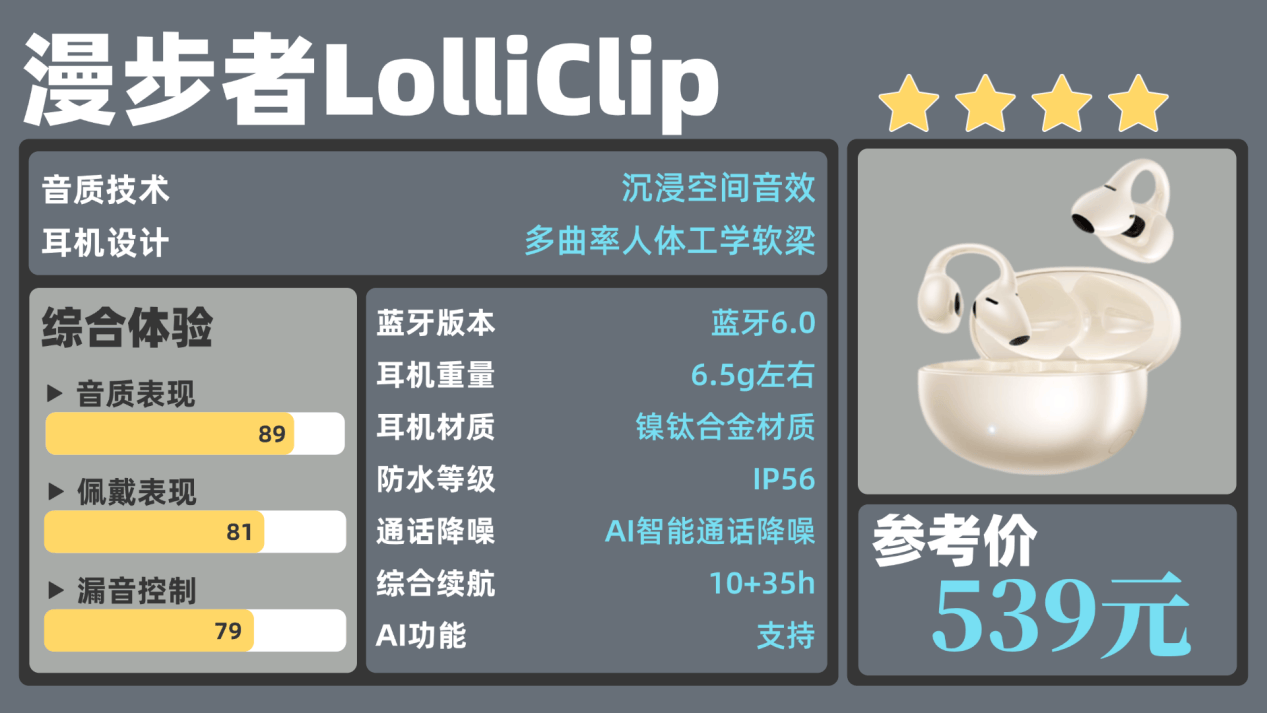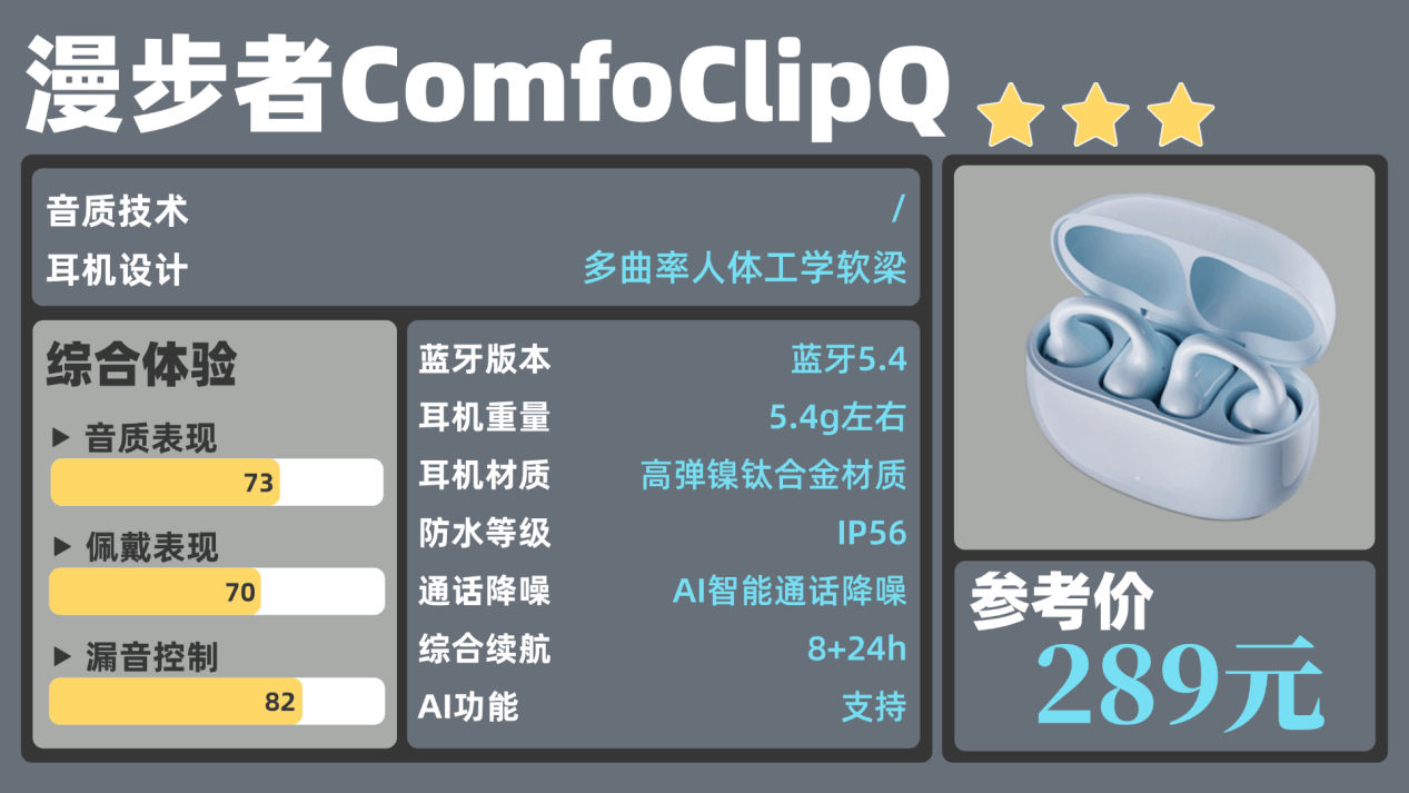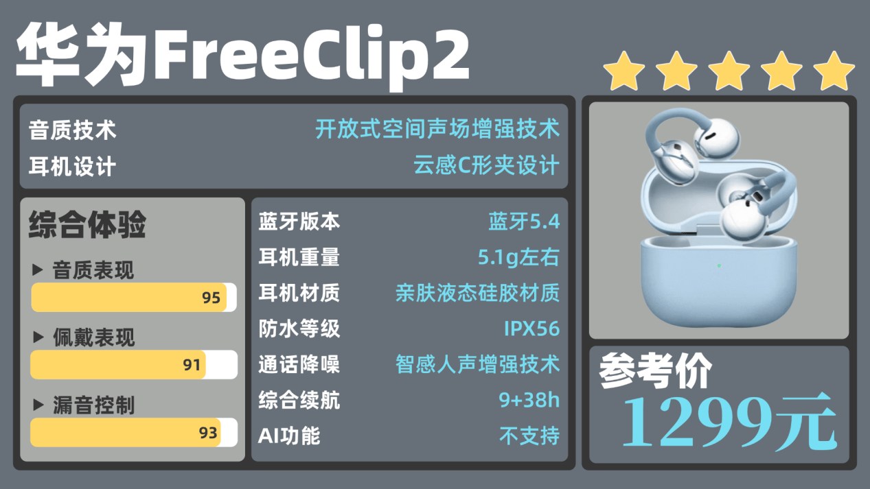 推荐理由:综合表现最好的耳夹机型,佩戴、音质、AI功能三旗舰达千元水准