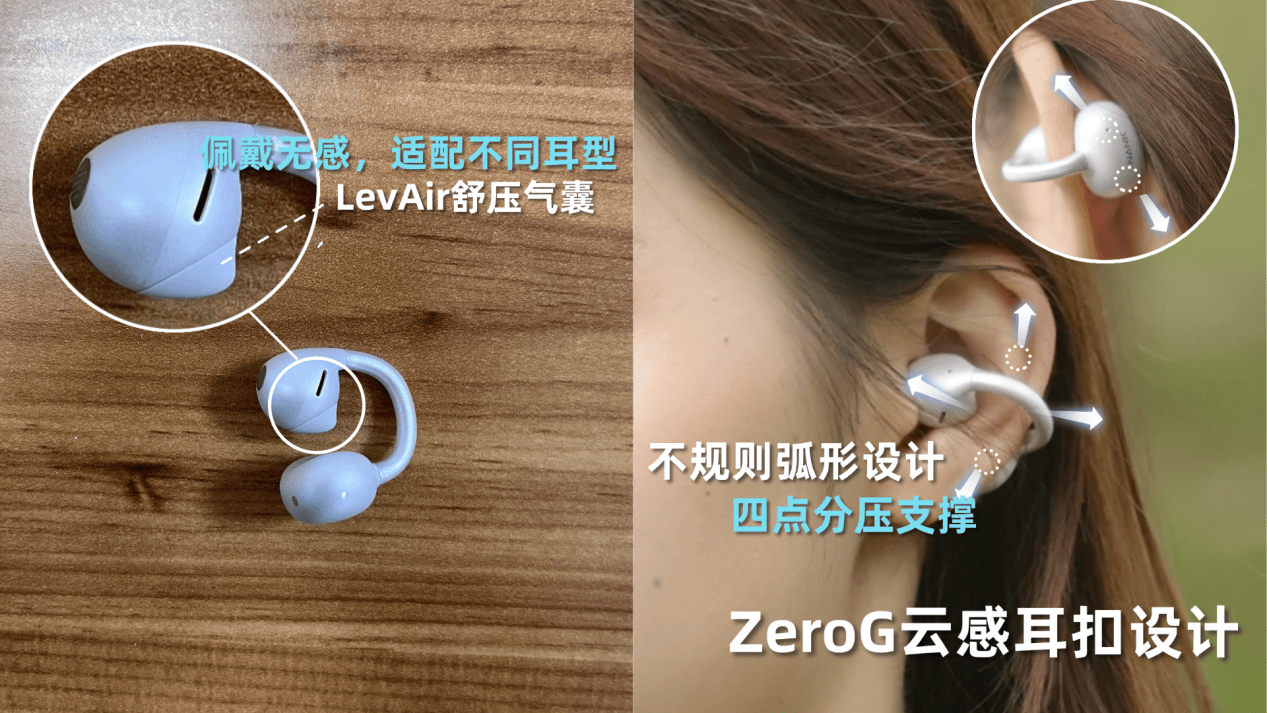 佩戴体验:南卡clippro采用的是BUF环扣人体工学设计,是在传统C形夹的基础上多了一段长条板,在耳朵上形成三点支撑,能够更好的分散耳机重量,耳夹也能更加贴合耳廓,日常跑跳都不会掉。且clippro单耳重量仅5.1g,日常戴一整天耳朵也不会痛,真正实现了零压零感佩戴。