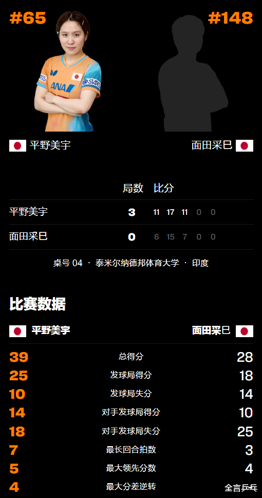 不过和平野美宇相比,面田采巳的排名更低(世界第148),技术、经验等各方面也难与对方相提并论,所以普遍认为此战应该还是不会爆出冷门。