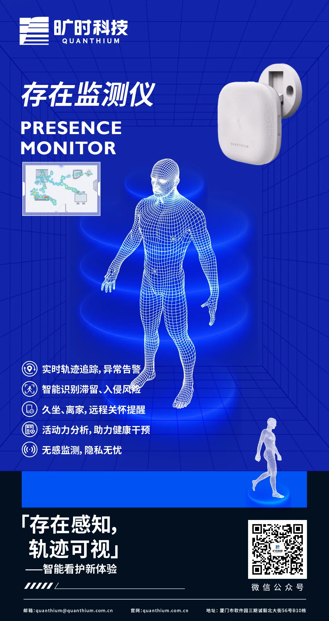 存在监测仪是旷时科技为智慧养老开发的毫米波雷达健康监测设备,用于室内非接触式、无需穿戴的人体方位、活动情况检测,可对长者移动、站立不动或坐着微动等状态进行感知,能灵活设置感知方位和感应距离、轨迹跟踪,实时感知长者距离和方位。并配有智慧康养预警平台、小程序等完善的配套设施,具备语音对讲功能,更全面地守护长者的安全。
