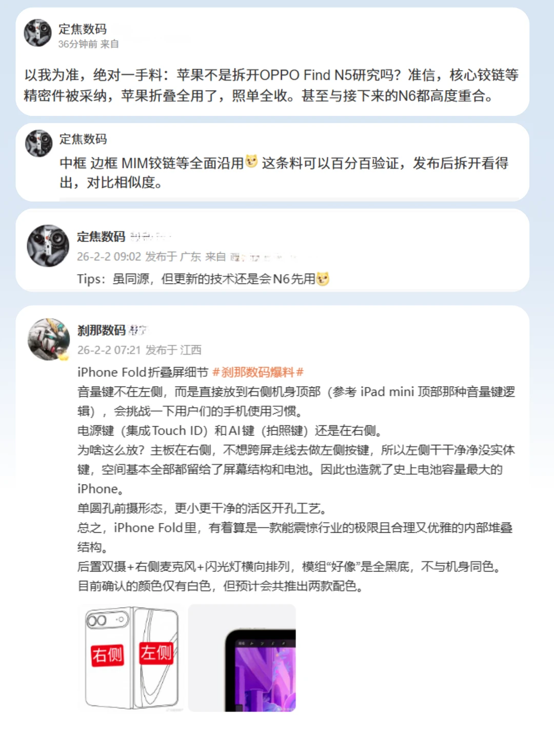 更有意思的是,数码圈都在传苹果为了做自己的折叠屏iPhone,私底下买了OPPO Find N5回去拆解研究!据博主“定焦数码”说,苹果对里面的核心铰链技术很感兴趣,甚至可能“照单全收”。这可是苹果啊!居然要向我们的国货取经了?