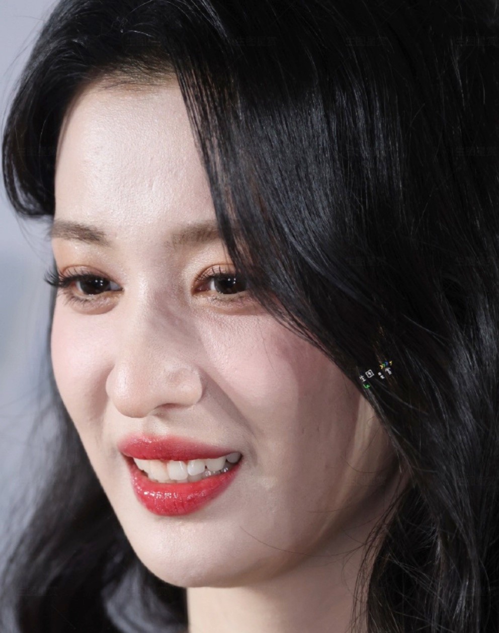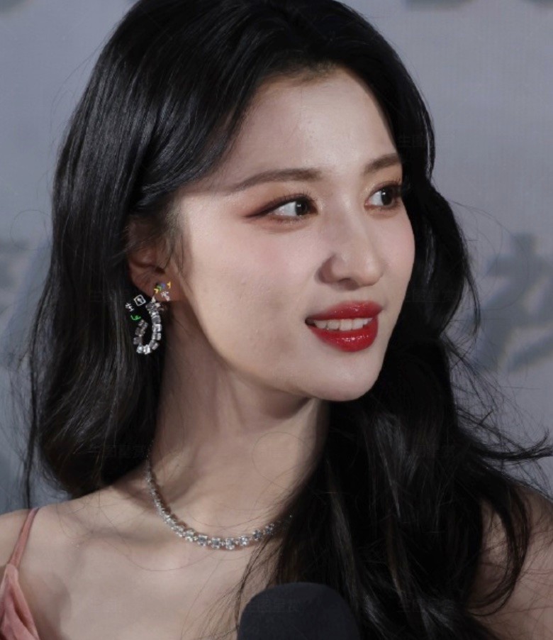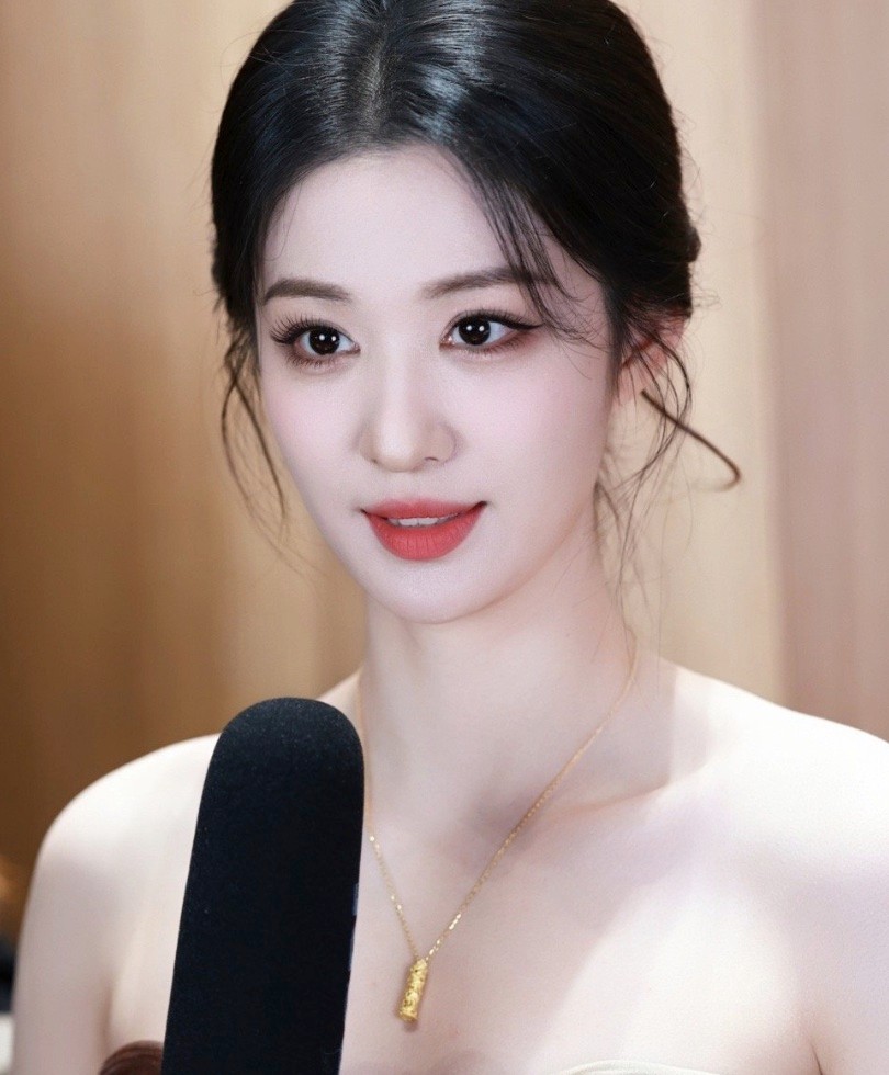 妆容不浓不淡,重点突出眉眼,清透底妆搭配冷白皮,在灯光下白到发光,既有少女的元气,又有成熟女性的舒展大气。