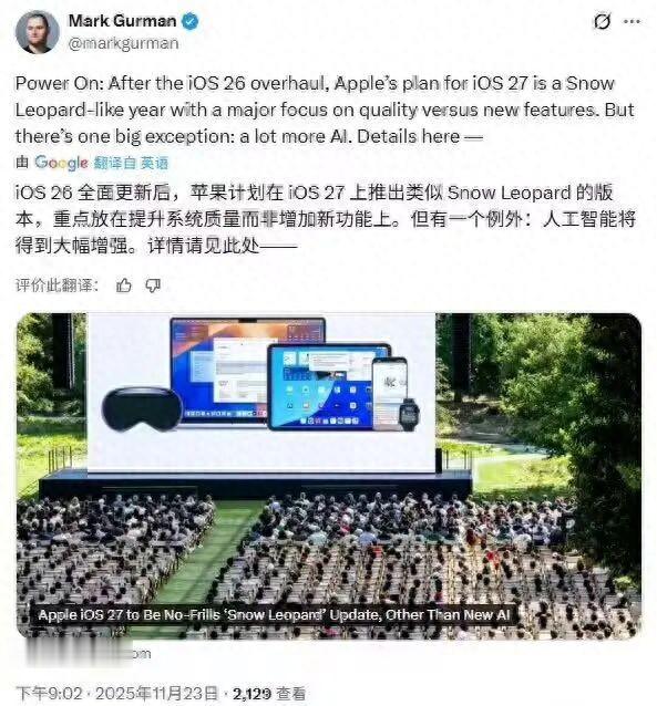 DoNews11月24日消息,11 月 23 日,马克・古尔曼发布了最新一期 Power On 时事通讯。他表示,苹果明年将推出以稳定性为核心的 iOS 27 系统更新,并在保持“无新增功能”基调的同时提升系统质量并强化 AI 能力,苹果希望借此为后续产品奠定技术基础。