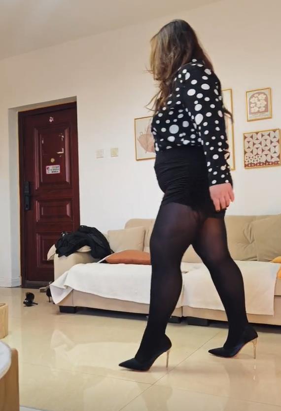 上身穿着黑色为底色的长袖,衣服上面有很多白色的圆形图案,下身穿着比较时尚的包臀裙,然后搭配着黑色的丝袜,在女子的脚上还踩着高跟鞋,鞋跟还比较细,是一种比较性感的鞋子。