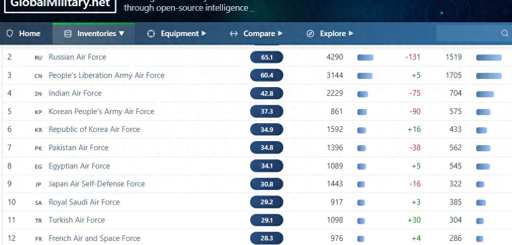 至于一些老牌空军强国,如德国、法国、以色列等,排名都在10名以外,英国皇家空军甚至掉出了20名。