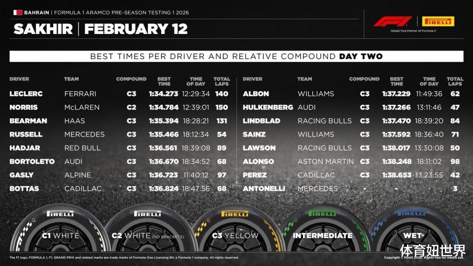 共有16位车手上场的巴林季前测试第2天的最快圈速全由负责全日测试的3位车手拿下,其中勒克莱尔在前半时段将季前测试的最快参考单圈推进至1分34秒273,落后约0.5秒的诺里斯则是取得最多的150圈。