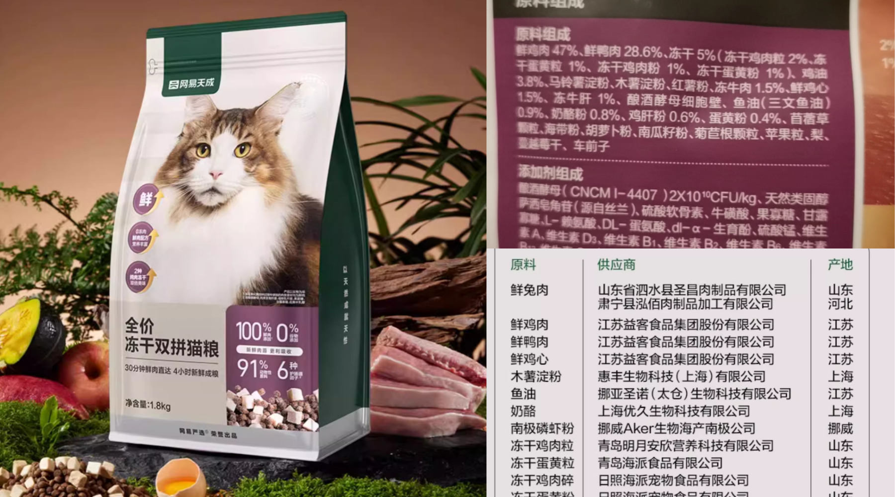 网易严选本来是做生活类电商的,后来布局宠物食品领域,慢慢攒了不少用户。它的猫粮配料表做得挺清晰,鲜鸡肉、鲜鸭肉这些核心原料,不仅写清了种类,还标了具体占比,肉源的第三方溯源也齐全,鲜鸡、鲜鸭、鸡心都来自江苏益客。网易严选猫粮怎么样?营养上也能满足猫咪需求,蛋白质≥44%,动物蛋白供给充足,脂肪≥19%在15%-24%的适宜区间内。