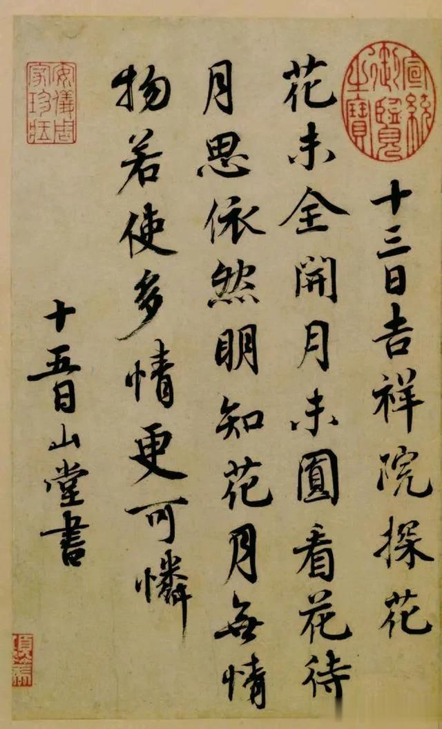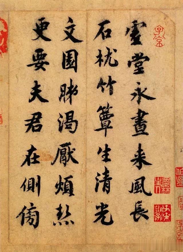 最动人是他字里的“烟火气”:尺牍里“体履佳安”的捺画舒展如晚风,《山堂诗帖》中“花月多情”的点画软如落英,连碑刻的方笔都带着纸笔摩挲的温度。不似苏黄的放达,蔡襄以“稳”见情——笔锋的收放像君子的进退,墨色的浓淡是文人心绪的浅深。