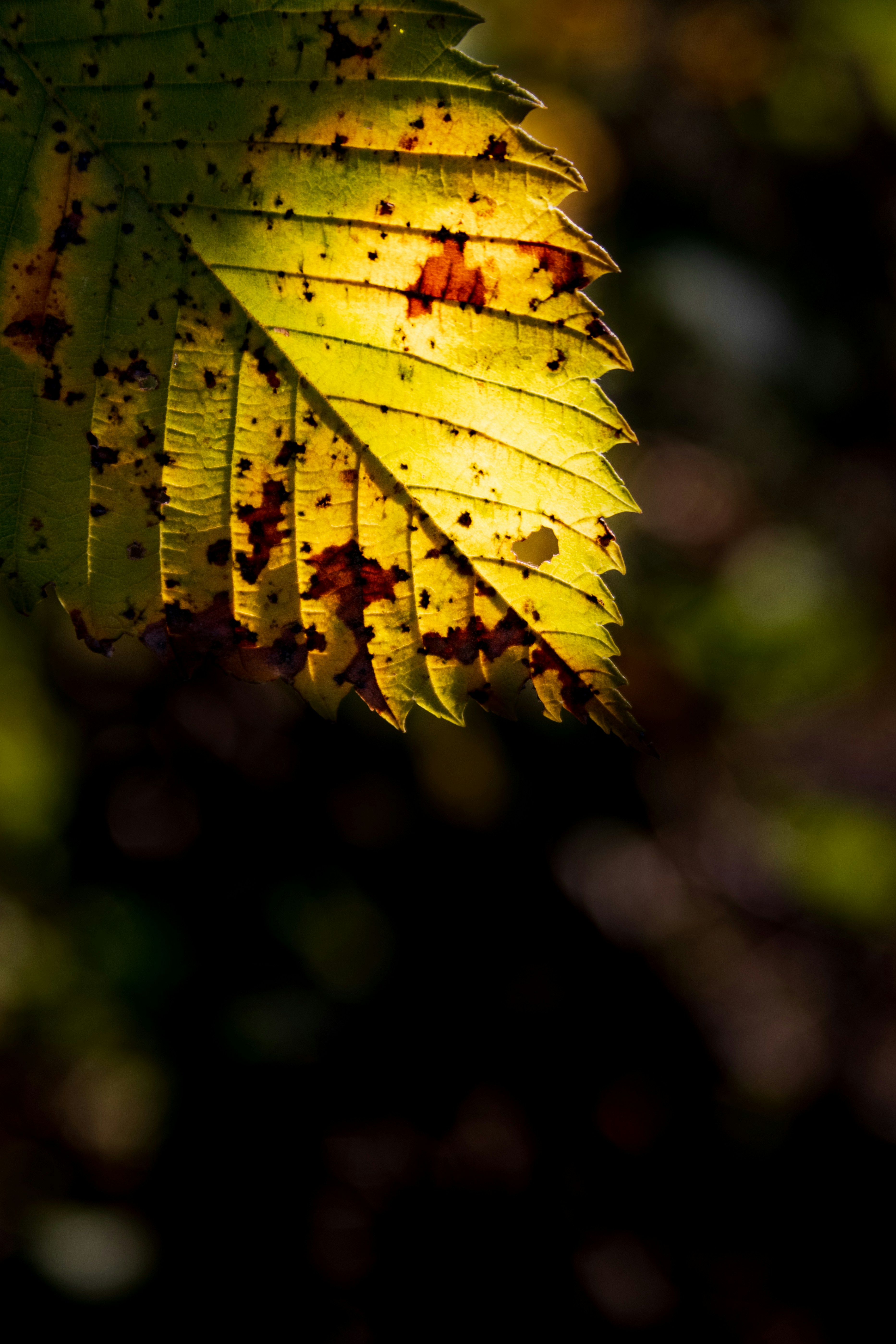特写与微距:不要只拍整片叶子,凑近了拍,去拍叶脉的交错、虫蛀的洞孔、霜打的斑点、水珠的倒影。