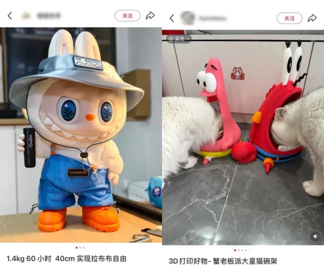 家庭用户的玩法更花样百出。小红书上,有人打印Hello Kitty盘子、皮卡丘纸巾盒,把“生活小物”玩出定制感;家长晒出孩子打印的恐龙、卡丁车,再也不用买现成玩具;还有人打印手机支架、收纳盒,家里缺啥就造啥——有个用户说,“以前坏了东西要等快递,现在打印一个当天就能用,感觉自己像拥有了‘马良神笔’”。连教育和医疗都被渗透了:高校用它做科研模型,牙科诊所打印牙齿模型,珠宝店做首饰底托,以前“高精尖”的技术,现在成了“实用工具”。