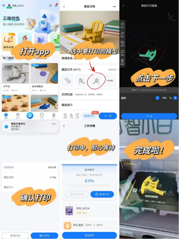 下图:打开APP选择模型一键打印,然后静静等待它完成即可(图源:电手优品)