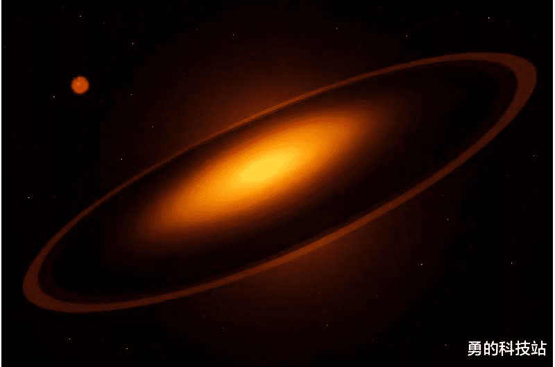 一幅艺术家对棕矮星或超级木星引起的恒星暗淡事件的印象,前景有巨大的环状物形成不透明的“碟形”,背景星ASASSN-24fw的部分光线透过其中。研究期间还在附近发现了一颗红矮星(左)。图片来源:S. Shah 等