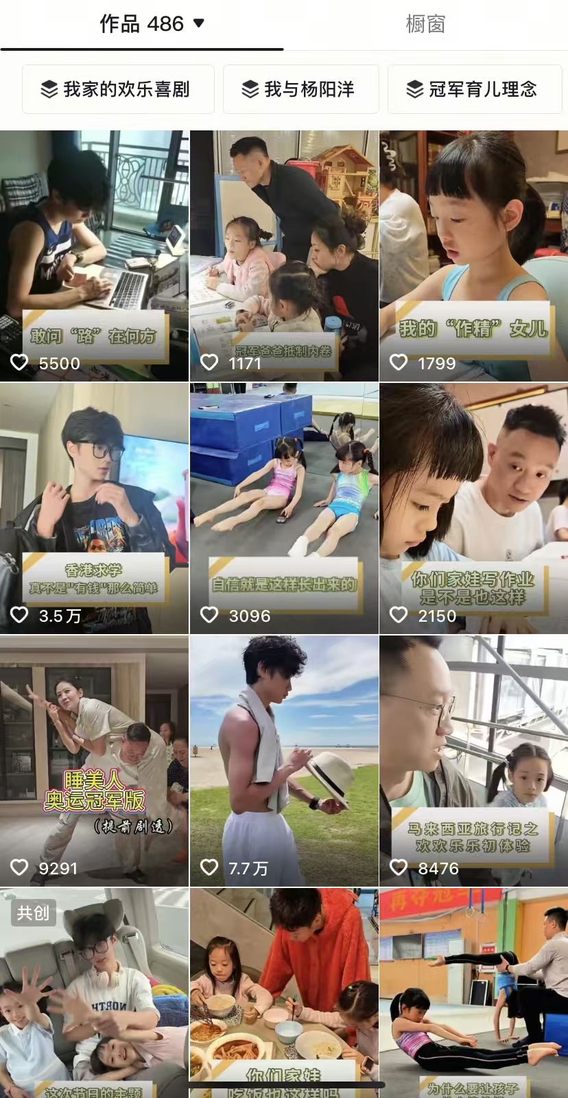 杨威的账号486个作品,基本都是关于他的孩子。两个女儿往体操方面培养,杨阳洋往国际方面培养。杨阳洋现在身高已经超越杨威,长相也很帅气,希望他能不辜负父母的期待,学业有成。