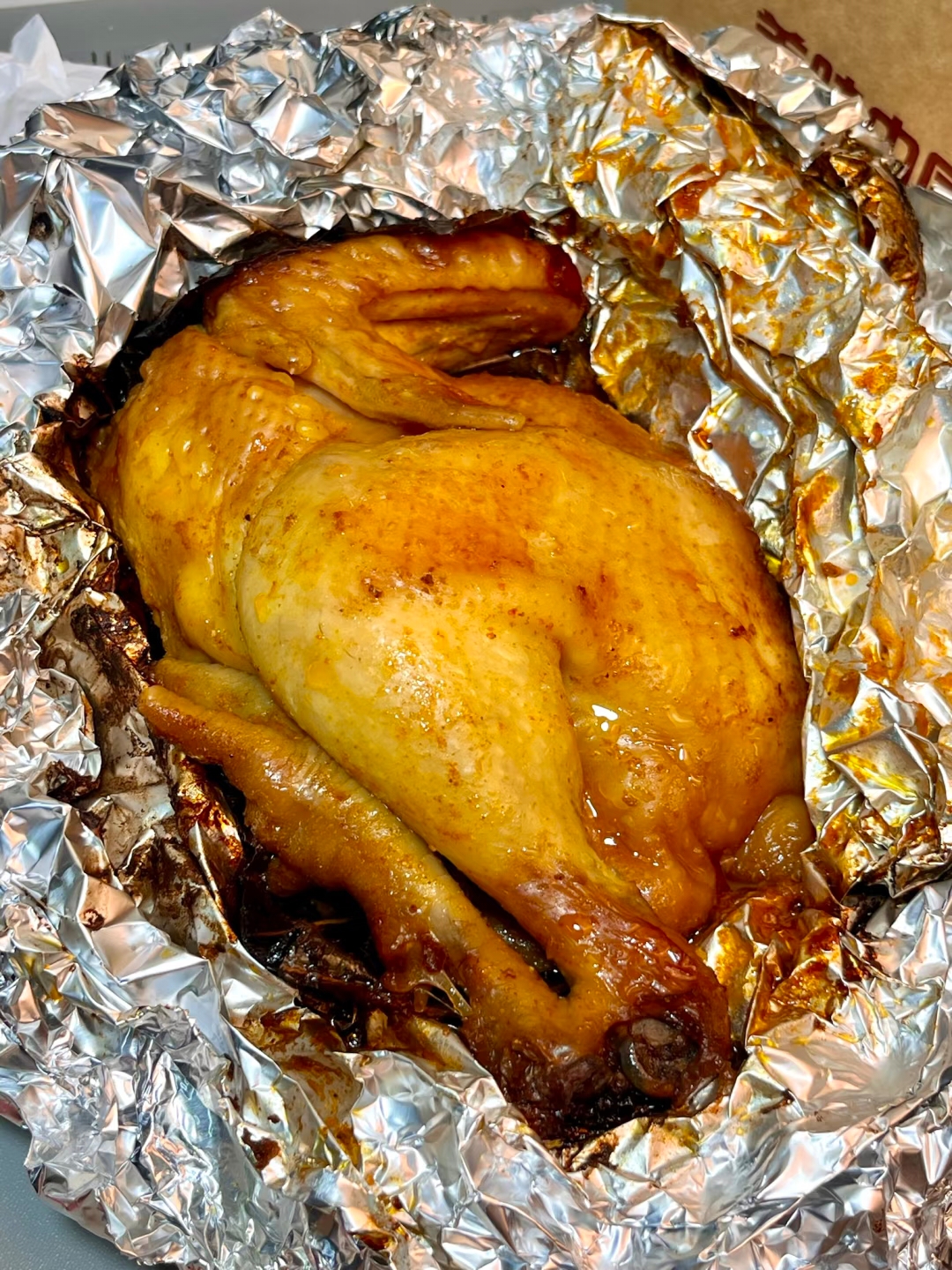取出腌好的鸡,擦干表面汁水(否则会变成蒸鸡)。先裹一层食用油防粘,再像包礼物般用双层锡纸严严实实包裹,接头处向上折起防止漏汁。