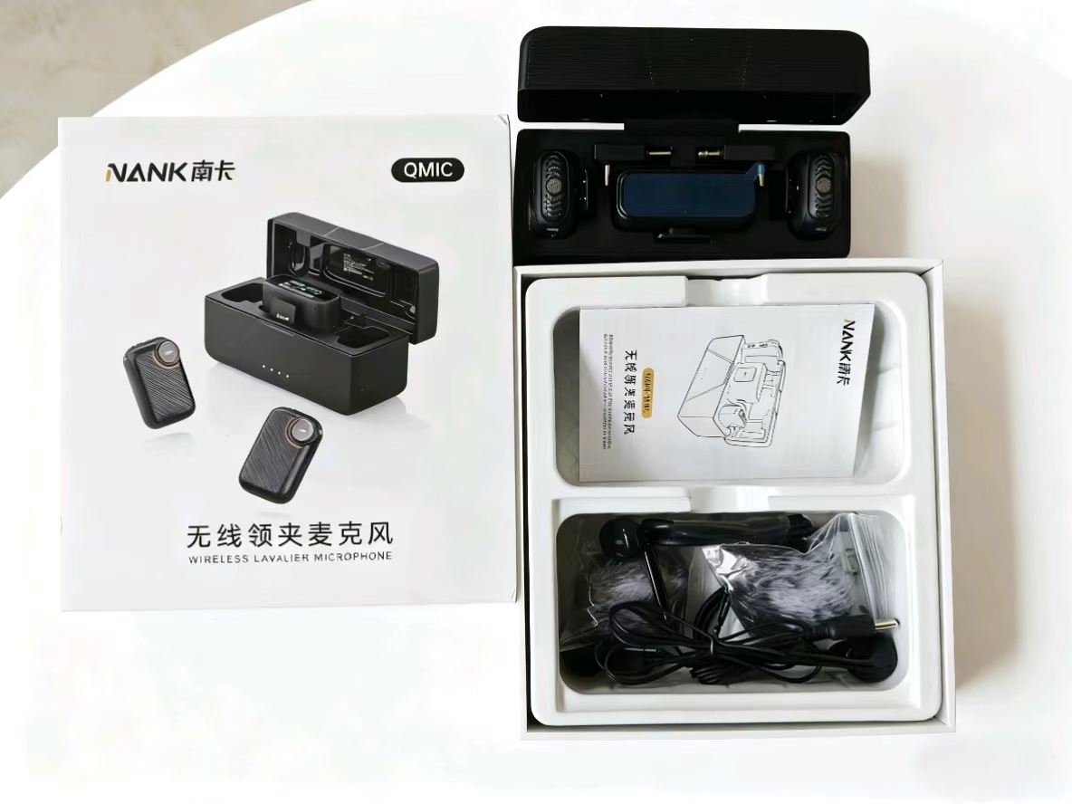 南卡Qmic的包装延续了品牌简约大气的风格,白色主色调搭配清晰的产品渲染图,开箱过程充满质感 。内盒采用分区设计,麦克风主机与配件各归其位,有效避免运输中的磕碰损伤。配件清单堪称"诚意之作":除双麦克风、接收器与充电仓外,还配备2个防风毛套、2根监听耳机、Type-C充电线、3.5mm双头线,以及Lightning和双Type-C转接头,手机、相机均能直接适配,新手无需额外采购配件 。