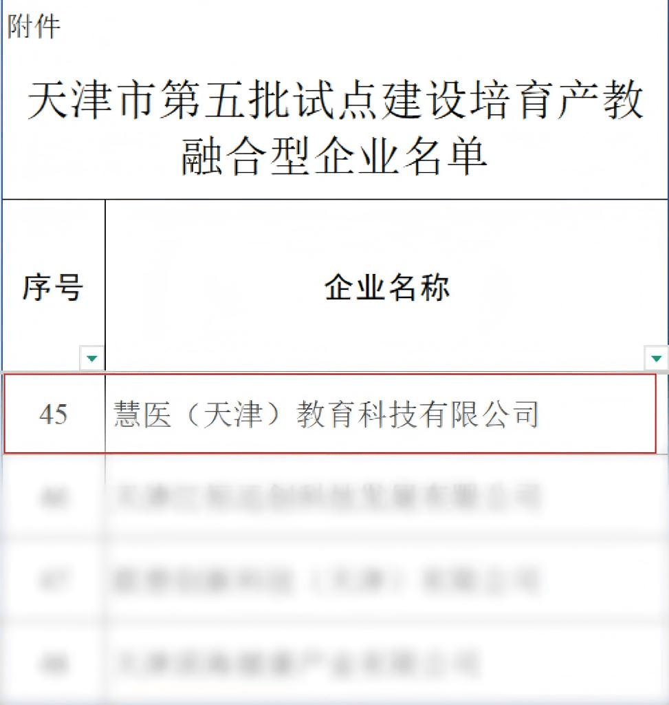 近日,天津市发展和改革委员会、天津市教育委员会联合发布《市发展改革委市教委关于公布第五批试点建设培育产教融合型企业名单的公告》(以下简称《公告》),经专家逐一审核、综合评定,慧医(天津)教育科技有限公司(简称“慧医科技”)成功入选天津市第五批试点建设培育产教融合型企业名单,跻身全市48家通过审核的企业行列。