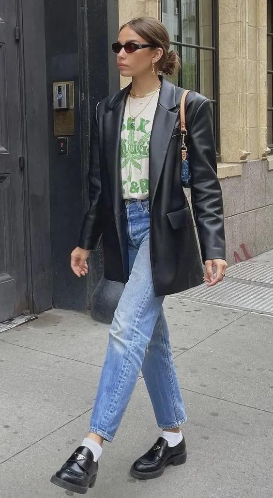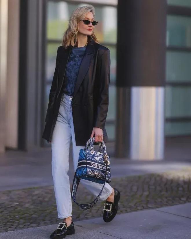 外加金属扣元素的乐福鞋搭深色牛仔裤,则更偏向于大气成熟。