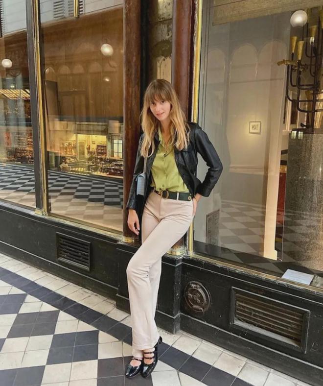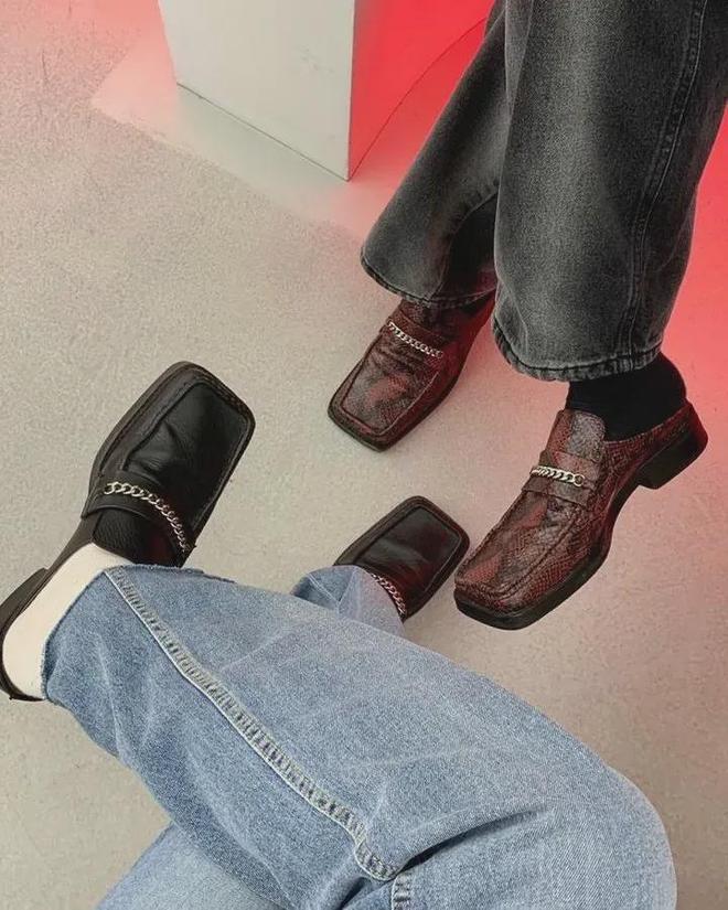 换成方头的穆勒鞋,上半身套一件西装或衬衫,正式感立马就出来了,很适合通勤。