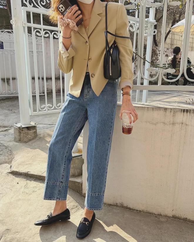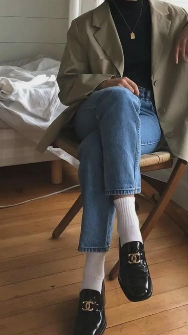 如果乐福鞋包住脚的面积稍大,牛仔裤建议选择九分长度的,微微露肤更能显腿长哦。