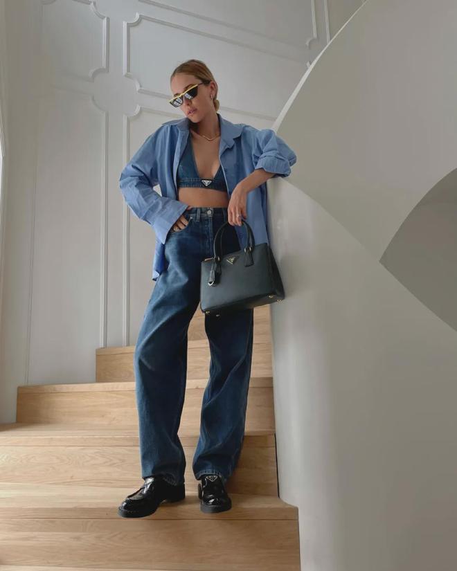 经典的Prada乐福鞋搭配阔腿牛仔裤,裤腿盖过脚面,有一种不羁的感觉,拿捏起来游刃有余~