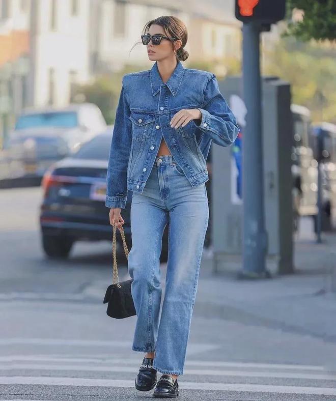 超模Cinndy Mello选择了用牛仔套装搭乐福鞋,看似很笨重,但实际上超显腿细! 而且出街这样穿舒服炸了!