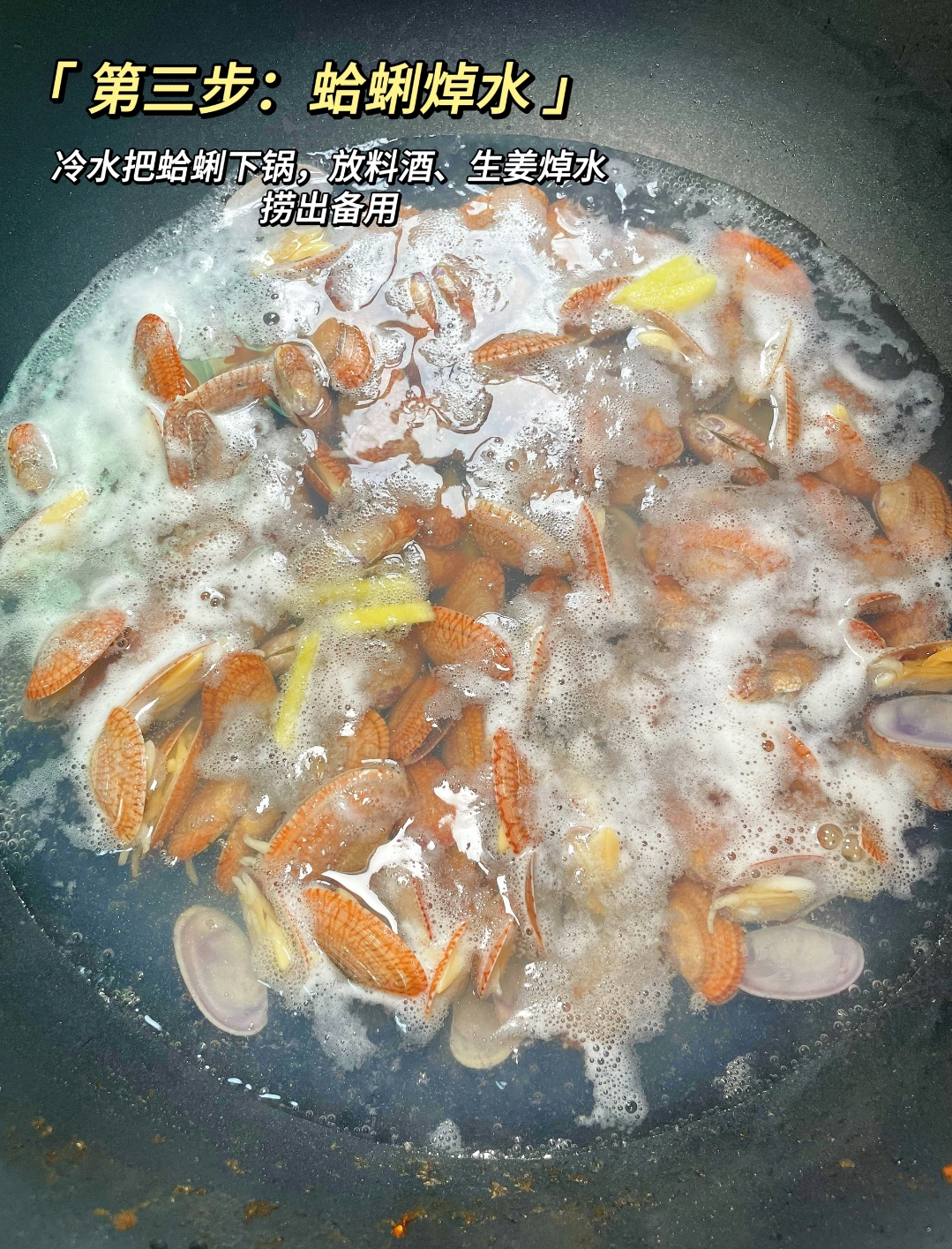 接下来就是正式的烹饪环节了。起锅烧水,记住要冷水下锅,把吐完沙洗净的蛤蜊放入锅中,丢入几片生姜,倒入适量料酒去腥。随着水温升高,蛤蜊会慢慢张口,看到蛤蜊开口后立刻捞出,沥干水分备用,切记不要煮太久,否则肉质容易变老。另起锅倒油,油热之后,就是爆香的过程。放入蒜末和姜丝煸炒,接着加入一勺豆瓣酱,这是这道菜红油色泽和酱香风味的来源,一定要小火炒出红油,香味瞬间就会弥漫整个厨房。