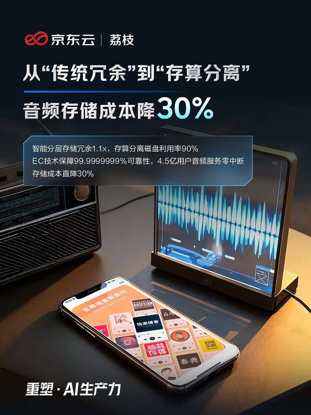 音频存储可视为一个低频文件需兼顾高安全与低成本的典型场景。像国内头部音频平台荔枝有数亿低频文件存储需求,京东云基于自研云海存储系统,为其构建过一套兼顾性能、成本与可靠性的存储解决方案。