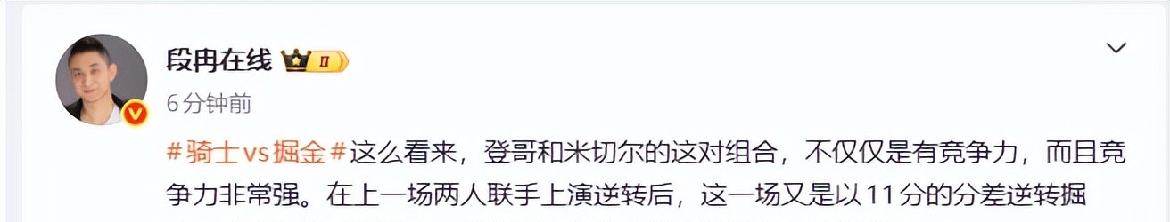 赛后篮球界专家段冉老师给出评价:这么看来,登哥和米切尔的这对组合,不仅仅是有竞争力,而且竞争力非常强。在上一场两人联手上演逆转后,这一场又是以11分的分差逆转掘金。登哥的关键球能力、组织能力让骑士的决胜阵容变得无解起来。