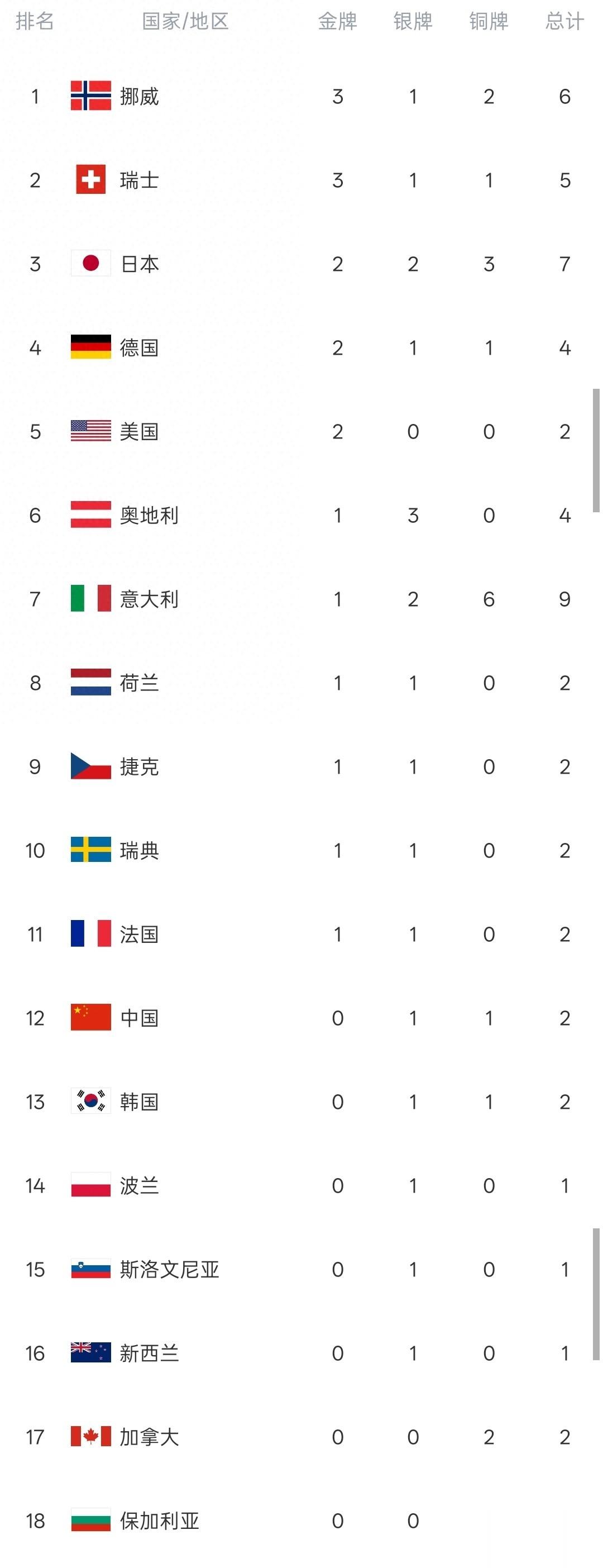 截止发稿时,目前金牌榜上冰雪强国挪威和瑞士各自获得3枚金牌,挪威队凭借多一块铜牌的优势占据金牌榜第一,瑞士排名第二。日本队拿到2金2银3铜高居金牌榜第三位,再次彰显了他们在冰雪项目上的强势。德国、美国同样获得两块金牌,分居第四和第五。拿到一块金牌的有奥地利、意大利、荷兰、瑞典、捷克与法国。中国代表团一银一铜占据第12位,与韩国并列。波兰、新西兰、斯洛文尼亚同样各自获得一块银牌,排名第14位。加拿大两块铜牌排名第17,保加利亚一块铜牌排名第18。