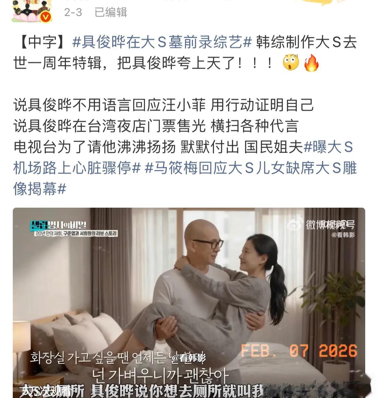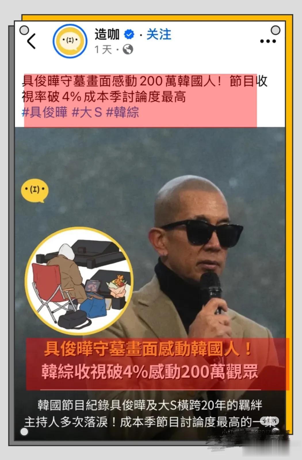 韩媒报道:韩国综艺节目制作大S去世特辑,播放具俊晔在大S去世这一年,每天去金宝山为大S守墓的视频,感动了200多万的韩国网友。该节目的收视创下了当季的最好播放量,收视率破4%,可谓异常火爆!
